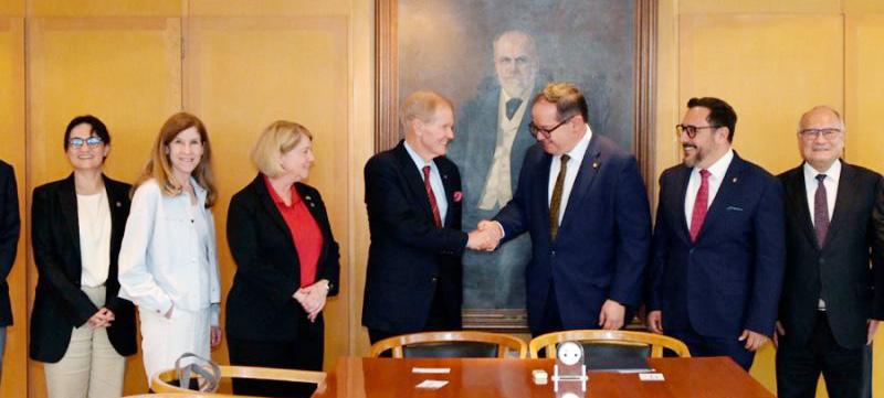CDMX.- El rector de la UNAM, Leonardo Lomelí Vanegas, acompañado por el director del Instituto Politécnico Nacional (IPN), Arturo Reyes Sandoval, recibió en sus oficinas de la Torre de Rectoría al titular de la Administración Nacional de Aeronáutica y el Espacio (NASA), Bill Nelson, para dialogar sobre las posibilidades de colaboración entre esa entidad y las instituciones de educación superior mexicanas.