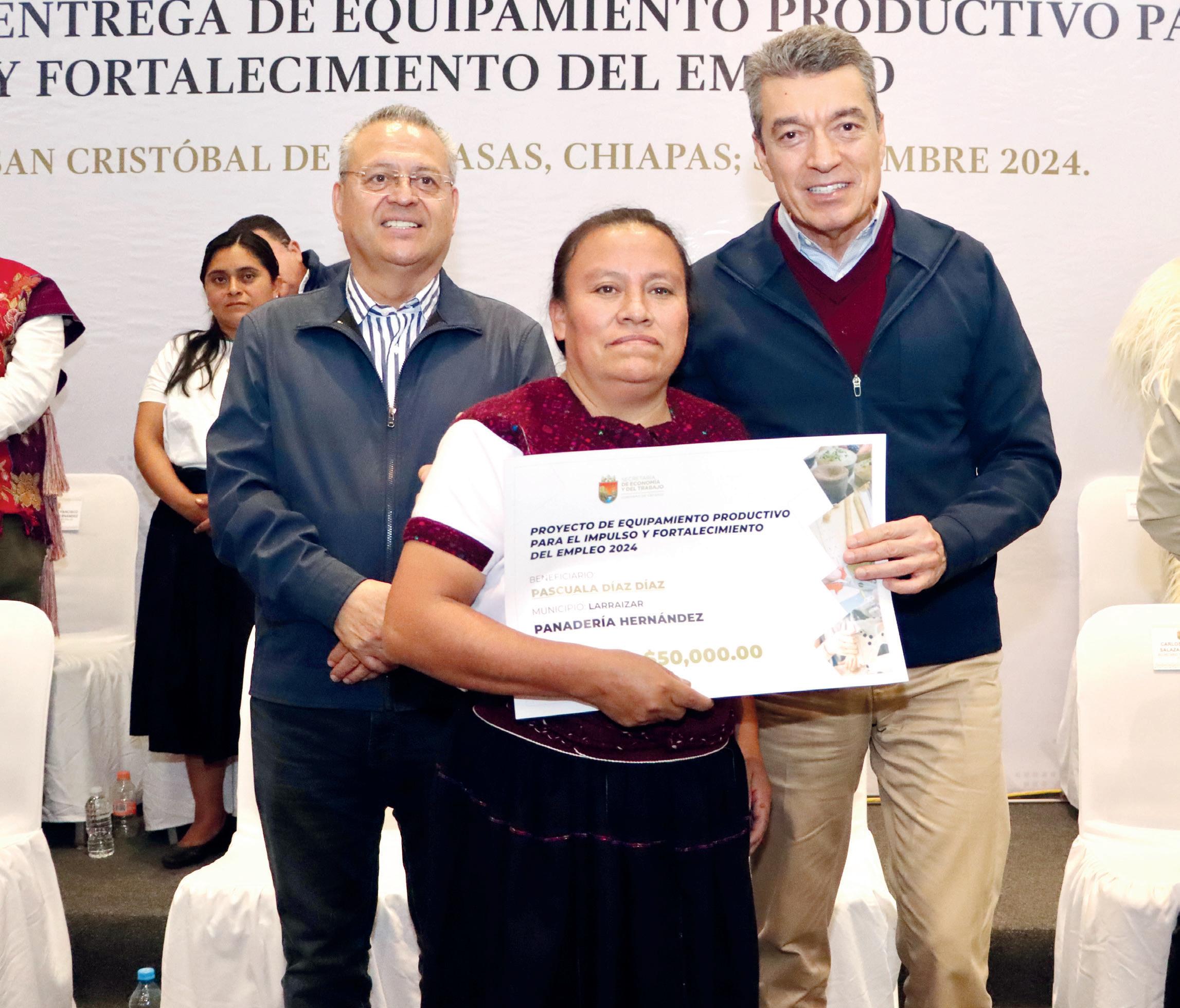 SCLC.-Con la finalidad de impulsar el autoempleo, el gobernador Rutilio Escandón Cadenas entregó equipamiento productivo a 122 personas de la región Altos Tsotsil Tseltal, quienes podrán iniciar o consolidar un negocio lícito, viable y rentable, que les permita generar ingresos.