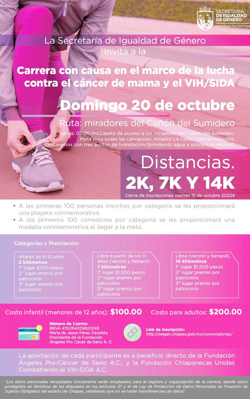 Lorenzana Borrego reiteró que, “con estas acciones se busca liberar conciencias sobre la importancia de cuidar el medio ambiente, practicar deportes al aire libre y reconocer el impacto que tiene sobre la salud” por lo que dio detalles de la carrera “se llevará a cabo el día domingo 20 de octubre a las 7:00 am, se considero la ruta de los miradores del Cañon del Sumidero; por ser uno de los principales atractivos turisticos del estado”, abierto a todo el publico, se consideraron las siguientes categorías: Infantil 2K, Libre 7K, Libre 14K. La titular de la Seigen Menciono que la Carrera tiene el objetivo de visualizar acciones para prevenir