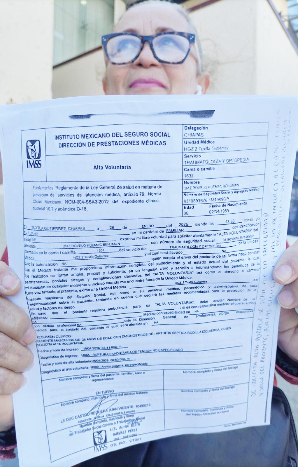 Tuxtla.- Yolanda Robelo denunció de forma pública que su hijo Benjamín Díaz Robelo, de 36 años de edad, fue víctima de presunta negligencia médica en el Hospital General número 2 del Instituto Mexicano del Seguro Social (IMSS), mejor conocido como “5 de Mayo” en Tuxtla Gutiérrez. En una entrevista, refirió que el padre de familia comenzó a tener problemas en su rodilla izquierda desde hace dos años, por una cirugía mal practicada en ese mismo nosocomio. Sin embargo, mencionó que el pasado 19 de enero él ingresó a quirófano por una reestructuración de su tendón, el cual estaba roto, “pero se encontraron con una gran infección, ya encapsulada, la rompieron, le hicieron su lavado mecánico, y tras hacerle una muestra de laboratorio, resultó con estreptococo”.