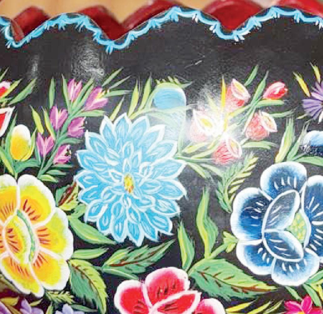 El proceso de laqueado consiste en decorar objetos de madera, jícaras, calabazas o guajes con una mezcla ancestral de aceites animales, vegetales y tierra blanca conocida como tizate. Esta base, una vez endurecida, permite aplicar pigmentos naturales directamente con los dedos, sin necesidad de pinceles, logrando así un acabado brillante, resistente y lleno de vida. Los motivos fl orales, los colores vibrantes y los patrones minuciosamente diseñados refl ejan no solo el gusto estético, sino también las creencias y el entorno cultural de la región.