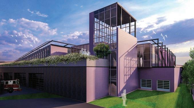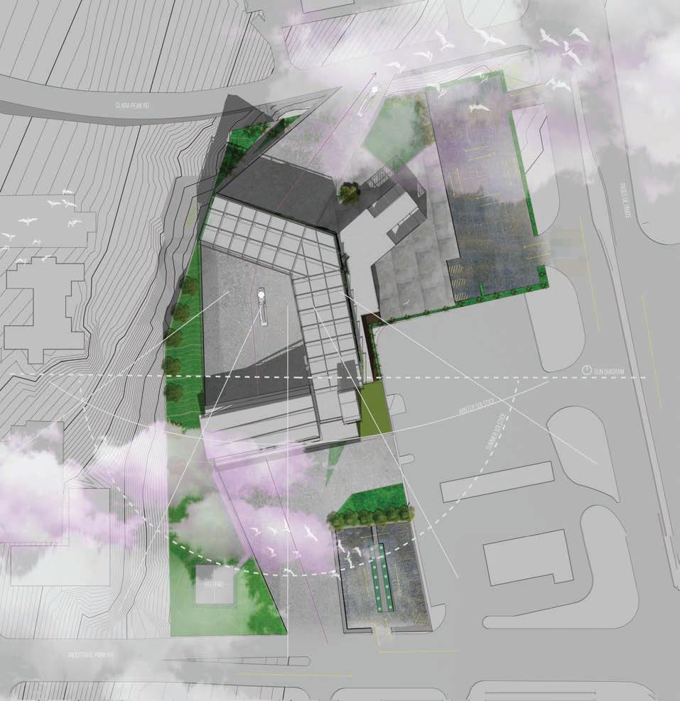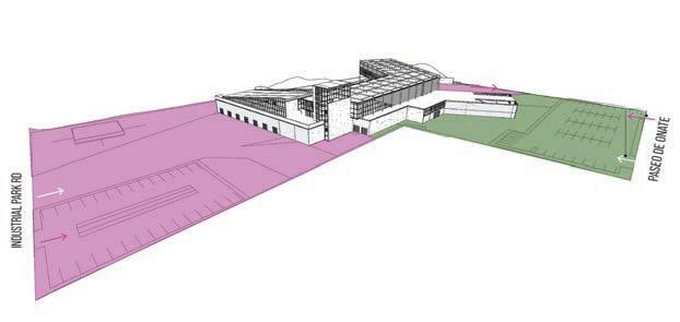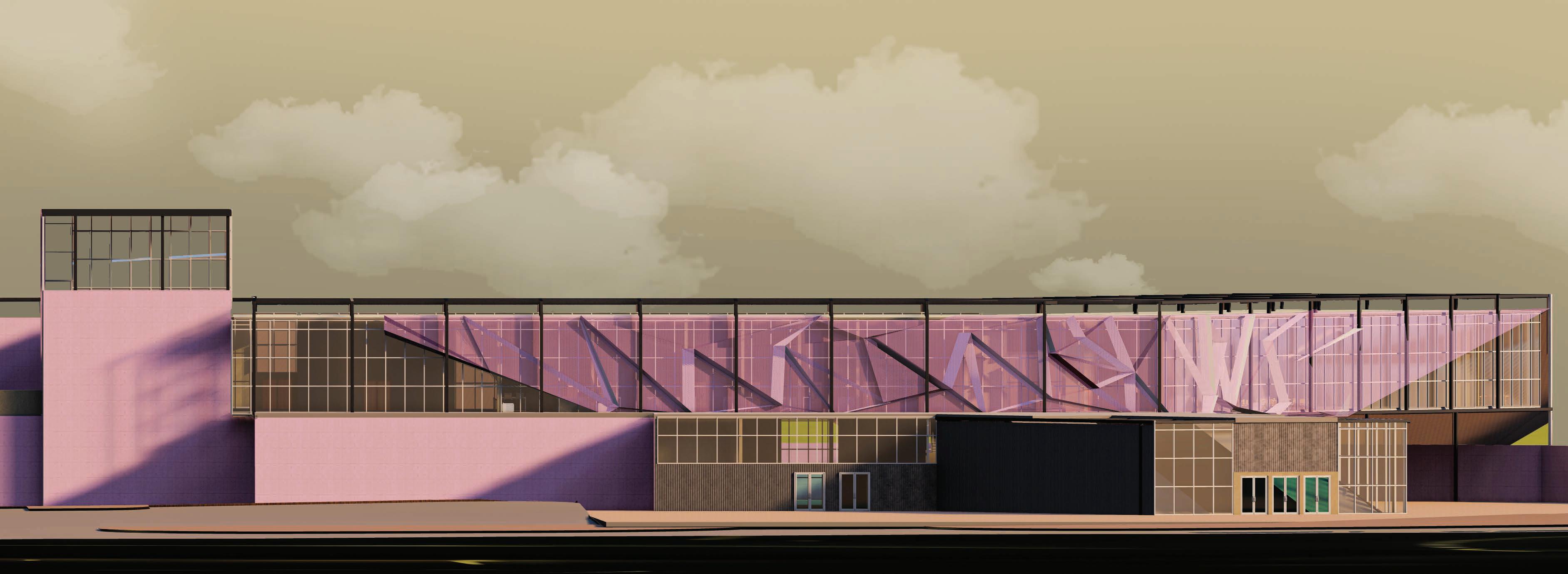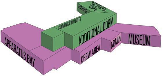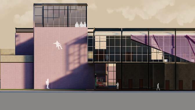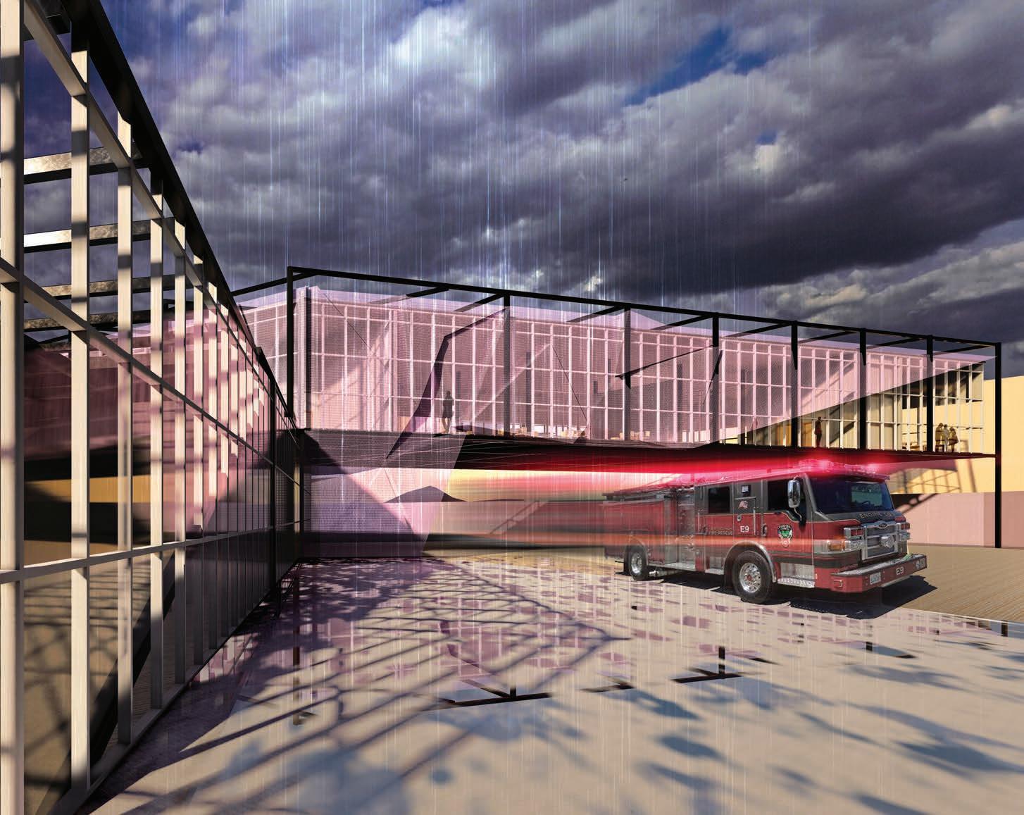 The Espanola Fire Station combines the Firehouse and civic center into one, allowing the boundaries of Public and Private Spaces to exist independently while creating opportunities for integration between the two. The Fire Station is divided into two floors, allowing the apparatus bays, crew area, and administration space to be housed on the first floor and the communication center, Mezzanine, and additional housing dorms on the second. Opportunities for unity between both programs are present between these public and private spaces taking place in, the memorial hall and museum are housed on the first floor and the training rooms, multipurpose center, and Terrace spaces exist on the second. Allowing these spaces of collaboration and unity also reflect on between the two programs, by using a soft pink. modular perforated metal facade. The fire station can accentuate the spaces within the public and private realm, as well as create a soft elegance to the fire station. Highlighting its civic component to the city, creating a welcoming atmosphere for its inhibitors.