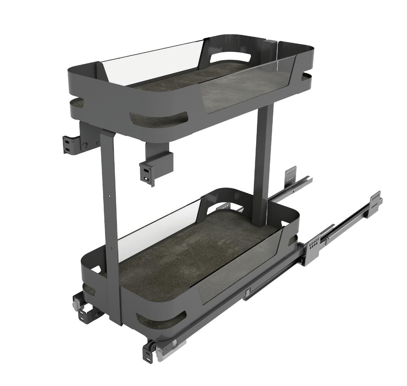 Mechanism for pull-out tandem, full extension slides with soft, capacity 80 Kg. Complete of 5 solid base baskets with painted metal sheet sides and laminate or glass insert, and door brackets.