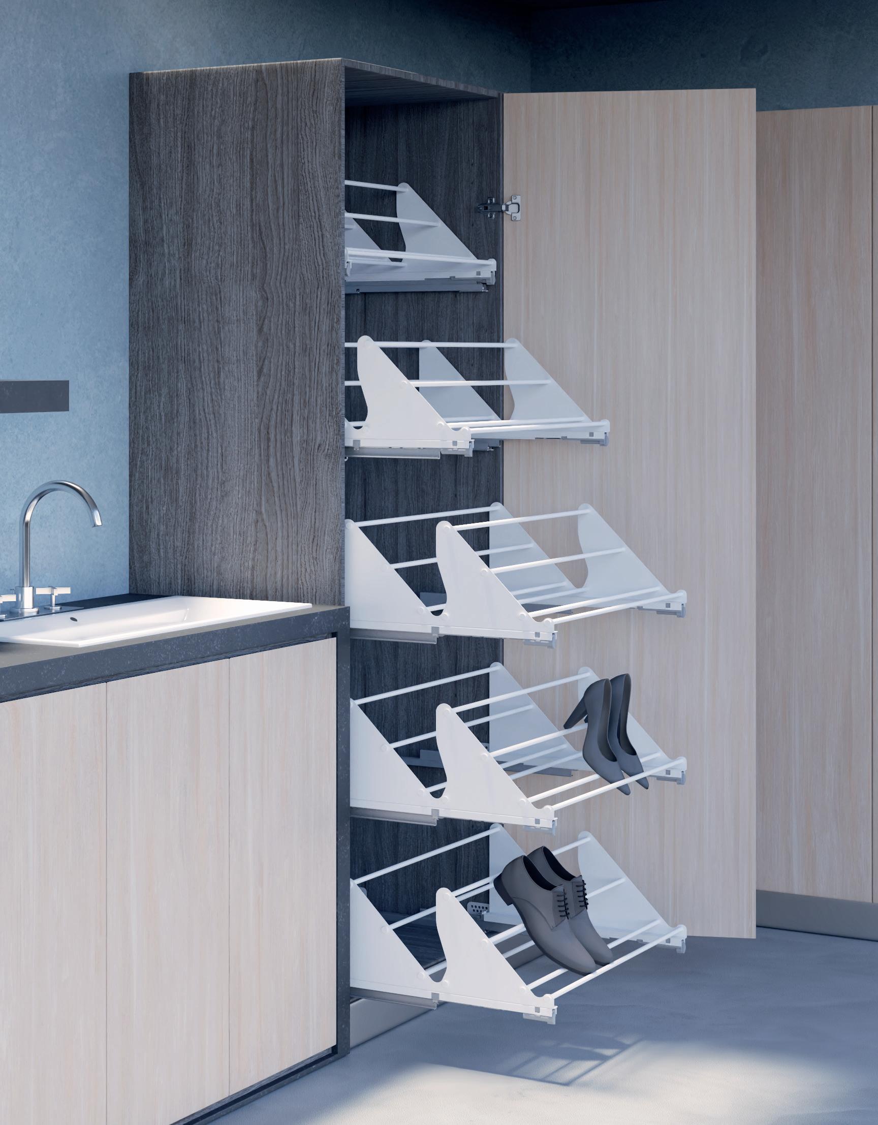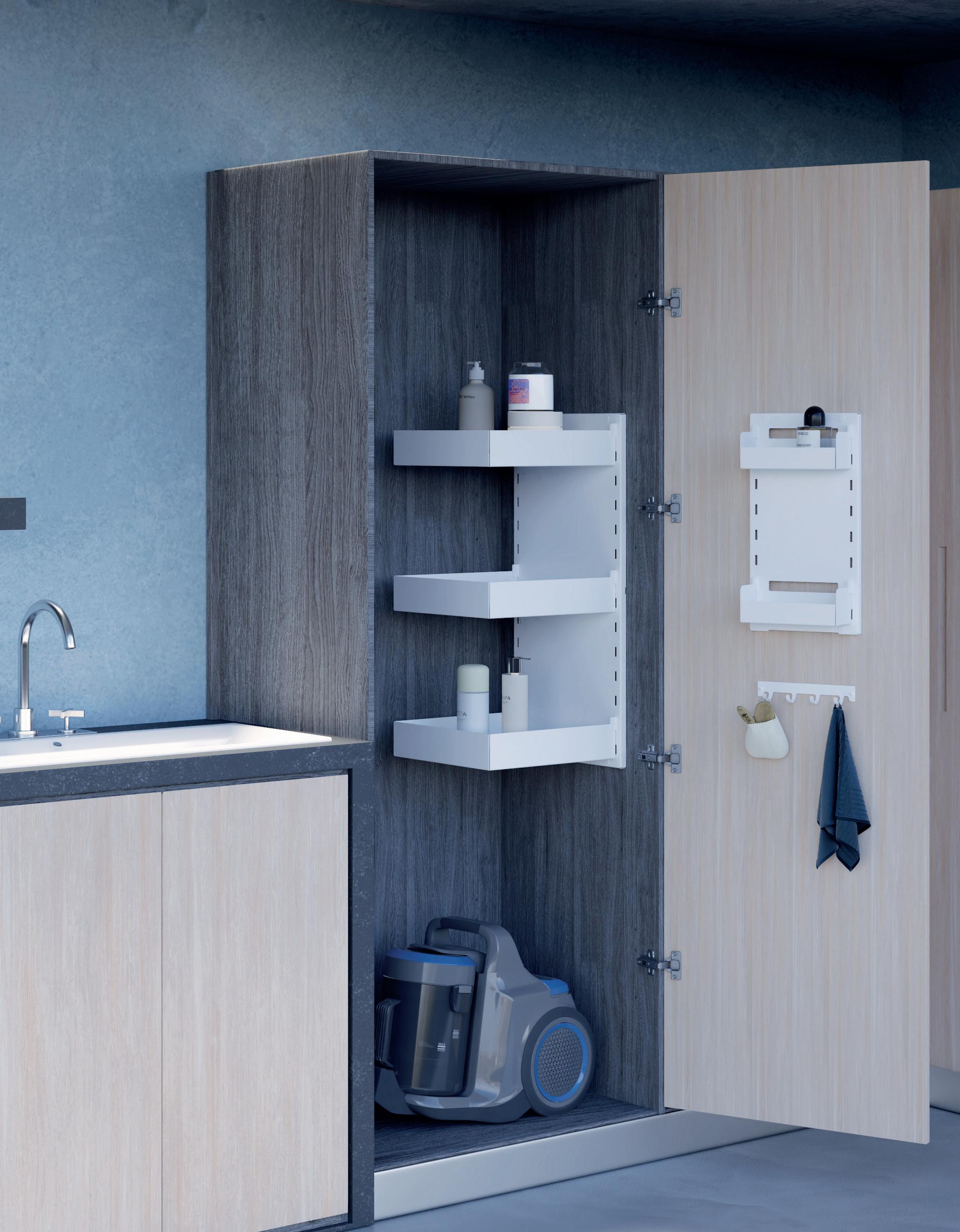 • il kit ripostiglio interno per mobili con struttura a tre ripiani e portascope/portatubo offrono un modo intelligente per collocare gli accessori dedicati alla pulizia, mentre i portascarpe, estraibili e regolabili, garantiscono un facile accesso e una conservazione ottimale delle calzature.