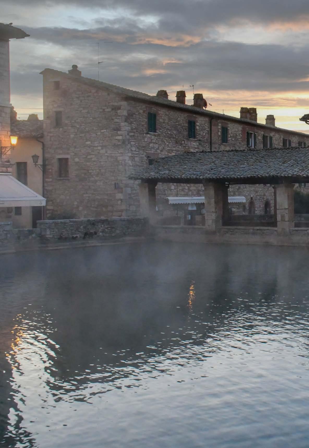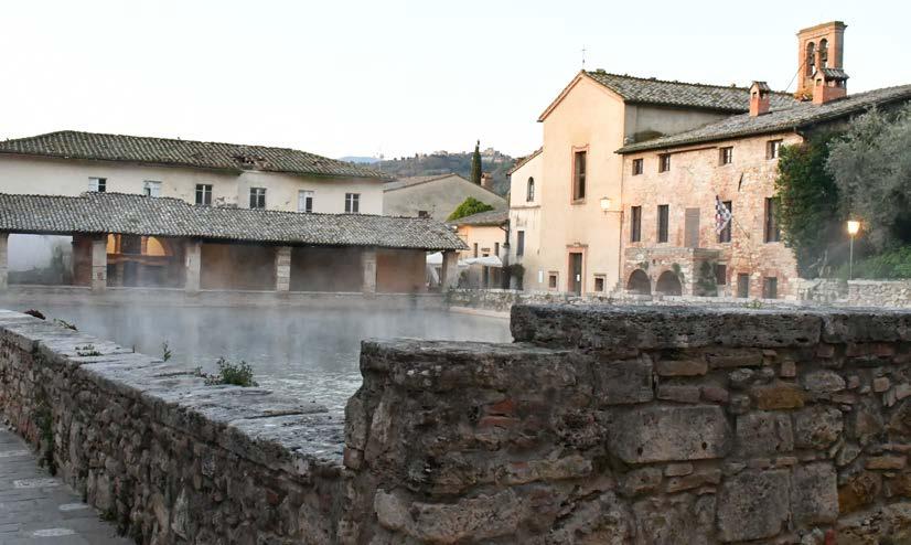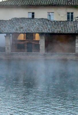 Era tutto vero, la vasca era lì da tempo immemore, forse dai Romani, o ancor prima dal tempo degli Etruschi, visto che raccoglieva acque termali che sgorgano ancora oggi. Una piazza d’acqua, incredibile! Tutt’intorno il minuscolo borgo di Bagno Vignoni, frazione di San Quirico d’Orcia, provincia di Siena. In una manciata di minuti lo si visita ma il richiamo è costante, quella piazza d’acqua ti entra dentro,