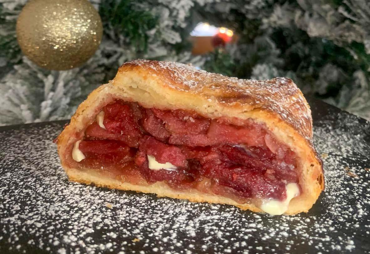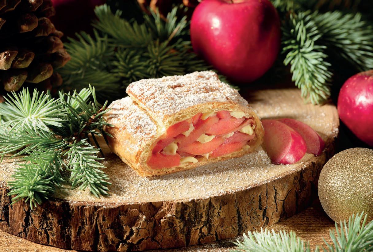 L’esclusivo strudel preparato con mele dalla polpa rossa, arricchito da scaglie di cioccolato bianco e un delicato tocco di cannella, avvolto in una pasta sfoglia al burro rifinita da una croccante copertura di zucchero in cristalli.
