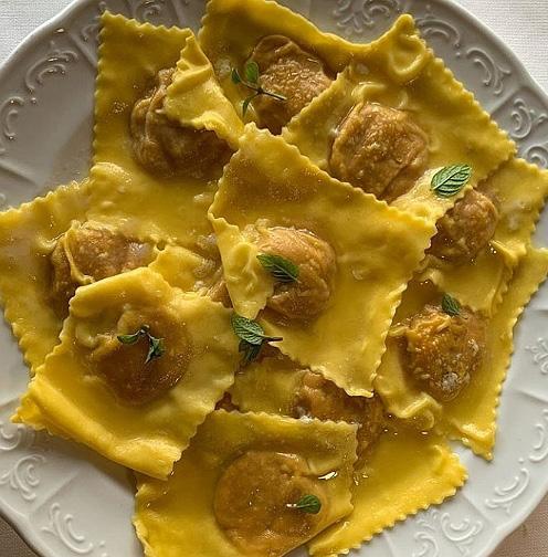 Ammollare il pane bianco tagliato a cubetti con poco latte e la salsa di cavolo viola, aggiungere l’uovo e la farina necessaria per raggiungere la densità desiderata. Formare delle sfere di circa tre centimetri e cuocere in abbondante acqua salata, scolare e condire con il burro, la salvia e i gallinacci.