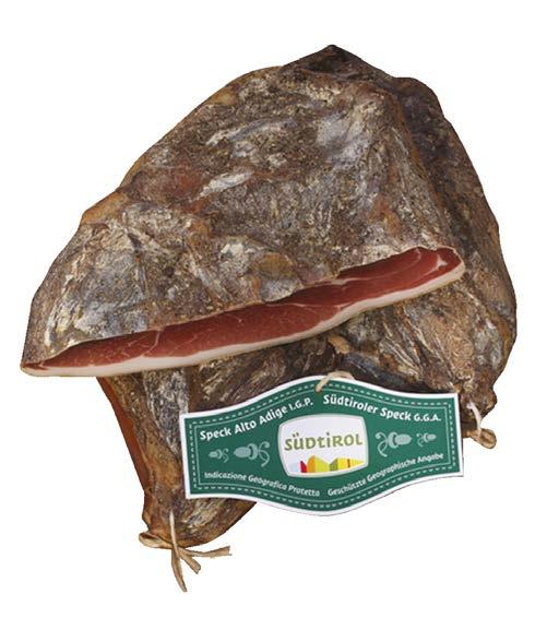 kg per lo Speck in quarti e circa 800g per lo speck 1/6. Tra le sue caratteristiche rilevanti ci sono la salatura a secco moderata e l’affumicatura delicata ottenuta da segatura di legno di faggio che ne determinano le proprietà organolettiche.
