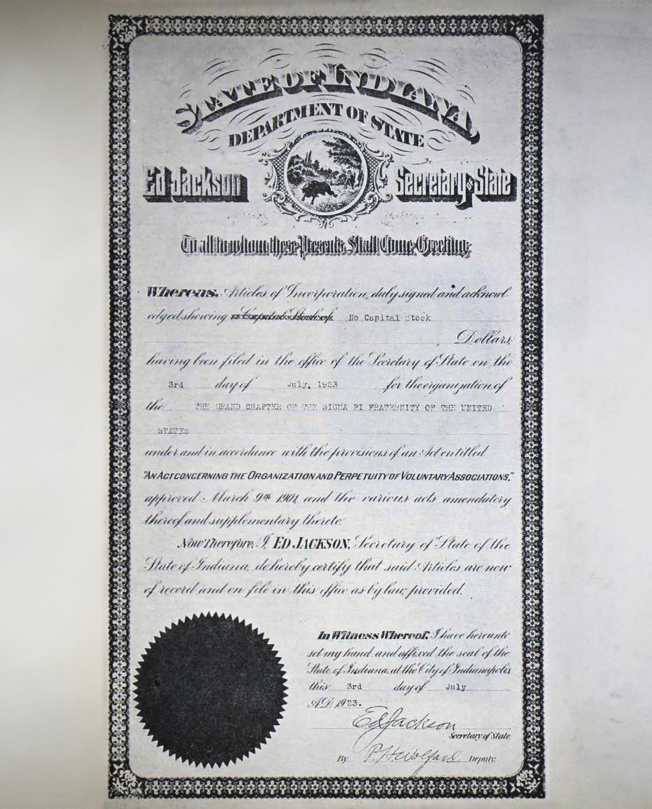 Acharter of incorporation was issued on July 3, 1923, by the state of Indiana to the Grand Chapter of the Sigma Pi Fraternity of the United States. This important step was taken by the Executive Council after considerable investigation of its advantages, and as a direct result of the increased holdings of the fraternity in recent years.