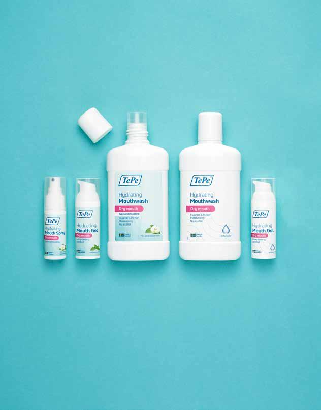 1 in 5 suffer from dry mouth, and water is usually the standard remedy. But for many people, water only provides brief comfort. TePe’s new hydrating mouthwash, mouth gel, and spray ease the feeling of dry mouth, provide comfort, and protect teeth.* The mouthwash contains fluoride, to help protect against cavities. We recommend the gentle, unflavoured products for those with a very dry mouth and the mildly flavoured products for those with moderate problems.