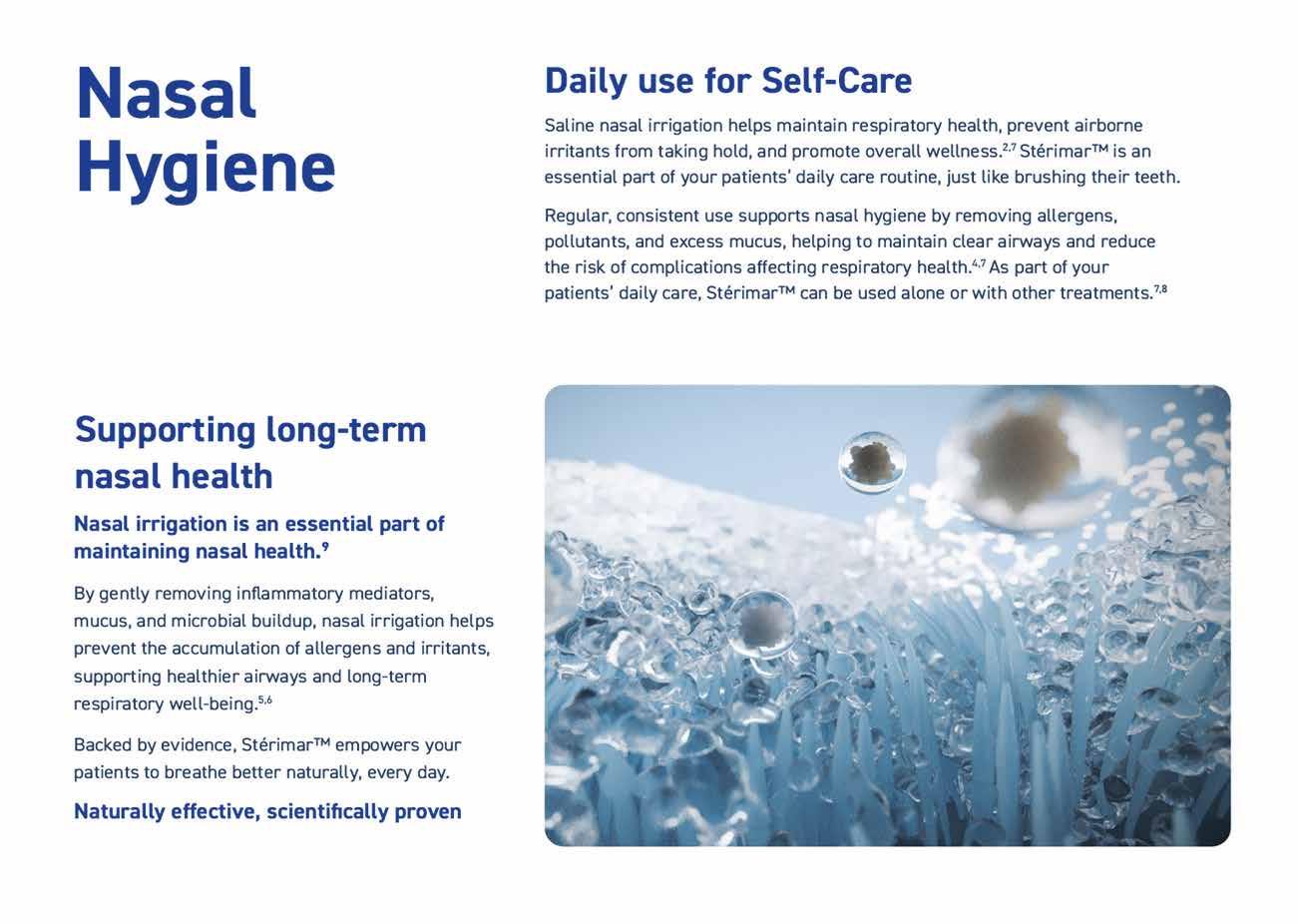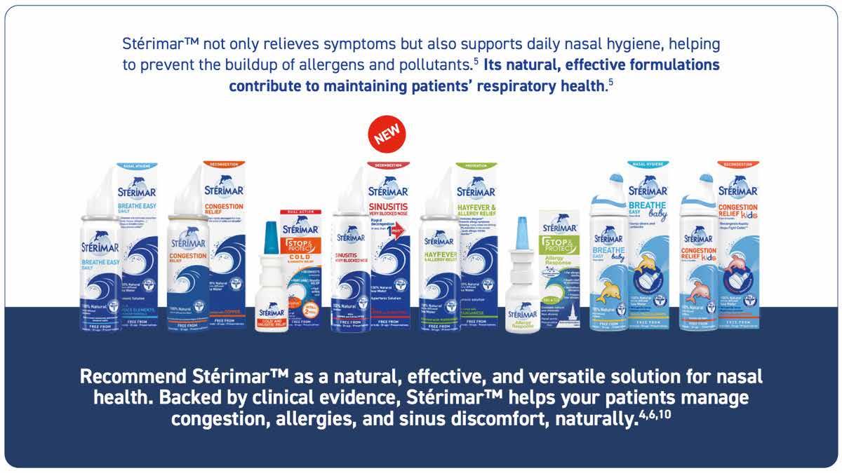 By gently removing inflammatory mediators, mucus, and microbial buildup, nasal irrigation helps prevent the accumulation of allergens and irritants, supporting healthier airways and long-term respiratory wellbeing.9,10 Backed by evidence, StérimarTM empowers your patients to breathe better naturally, every day.