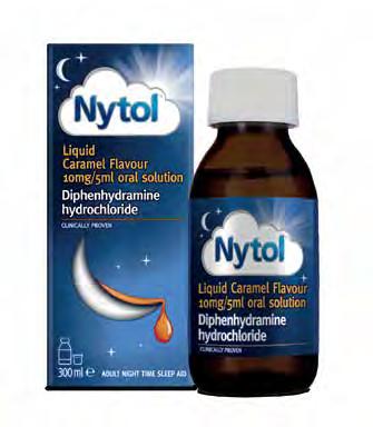 Nytol Liquid Caramel Flavour 10mg/5ml oral solution (P) contains diphenhydramine hydrochloride. As a sleep aid: as a short-term mild hypnotic. MAH: Omega Pharma Limited, Wrafton, Braunton, Devon, EX33 2DL, UK. Information about the product including adverse reactions, precautions, contra-indications and method of use can be found at: https://mhraproducts4853.blob.core.windows.net/docs/5b7be4aa5b67baa90e3e4f89381f9b88ed07b085. MAT-7330