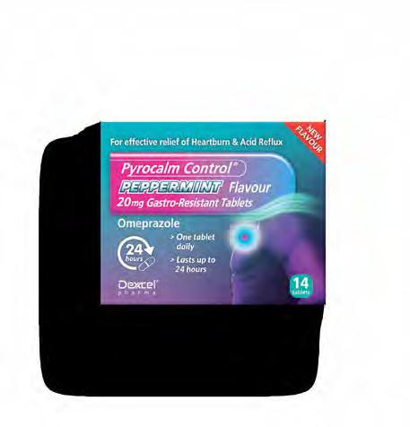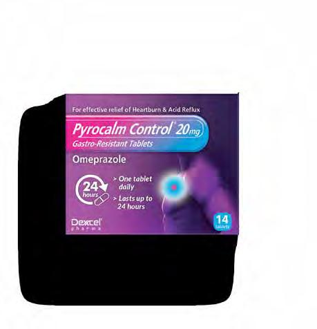 Product Authorisation Holder: Dexcel® Pharma Ltd. 7 Sopwith Way, Drayton Fields, Daventry, Northamptonshire NN11 8PB, United Kingdom. Legal classification: GSL. Product name: Pyrocalm Control® 20mg Gastro-Resistant Tablets. Ingredients: 20 mg Omeprazole. Indications: For the short-term treatment of reflux symptoms (e.g. heartburn, acid regurgitation) in adults. Information about this product, including adverse reactions, precautions, contra-indications, and method of use can be found at: www.medicines.org.uk/emc/ product/9154. Fertility, pregnancy and lactation: Pregnancy: results from three prospective epidemiological studies (more than 1000 exposed outcomes) indicate no adverse effects of omeprazole on pregnancy or on the health of the foetus/newborn child. Omeprazole can be used during pregnancy. Breastfeeding: Omeprazole is excreted in breast milk but is not likely to influence the child when therapeutic doses are used. Omeprazole can be used during breastfeeding. Fertility: Animal studies with the racemic mixture omeprazole, given by oral administration do not indicate effects with respect to fertility. 1NHS Digital, Practice level prescribing data 2018/19 2pubmed. ncbi.nlm.nih.gov/9692700/ 3www.statista.com/statistics/378445/prescription-cost-analysis-top-twenty-chemicals-by-items-in-england/