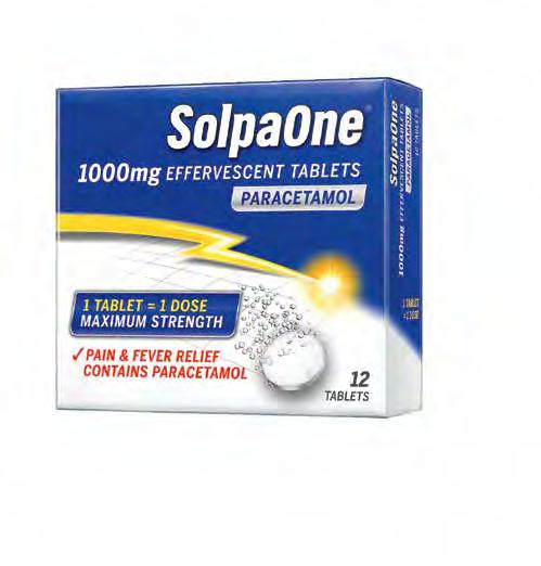 SolpaOne® 1000mg Effervescent Tablets (P) contain paracetamol. For short term symptomatic treatment of mild to moderate pain and/or fever. For adults and adolescents over 50kg of body weight aged 16 years and above. 1 tablet = 1 dose (take only one tablet at a time). Do not take more than 4 tablets (4000mg) per day. Do not use for more than 3 days unless on medical advice. Maximum paracetamol strength in 1 tablet. MAH: Cipla (EU) Limited Dixcart House, Addlestone Road, Bourne Business Park, Addlestone, Surrey, KT15 2LE, UK. Information about this product, including adverse reactions, precautions, contraindications, and method of use can be found at: https://mhraproducts4853.blob.core.windows.net/docs/0fa5f0aaeab6197db9e35e4f460b88b21e36e654 MAT-6357