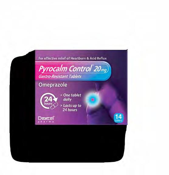 Product Authorisation Holder: Dexcel® Pharma Ltd. 7 Sopwith Way, Drayton Fields, Daventry, Northamptonshire NN11 8PB, United Kingdom. Legal classification: GSL. Product name: Pyrocalm Control® 20mg Gastro-Resistant Tablets. Ingredients: 20 mg Omeprazole. Indications: For the short-term treatment of reflux symptoms (e.g. heartburn, acid regurgitation) in adults. Information about this product, including adverse reactions, precautions, contra-indications, and method of use can be found at: www.medicines.org.uk/emc/product/9154. Fertility, pregnancy and lactation: Pregnancy: results from three prospective epidemiological studies (more than 1000 exposed outcomes) indicate no adverse effects of omeprazole on pregnancy or on the health of the foetus/newborn child. Omeprazole can be used during pregnancy. Breastfeeding: Omeprazole is excreted in breast milk but is not likely to influence the child when therapeutic doses are used. Omeprazole can be used during breastfeeding. Fertility: Animal studies with the racemic mixture omeprazole, given by oral administration do not indicate effects with respect to fertility. 1NHS Digital, Practice level prescribing data 2018/19 2pubmed.ncbi.nlm.nih.gov/9692700/ 3www.statista.com/statistics/378445/ prescription-cost-analysis-top-twenty-chemicals-by-items-in-england/