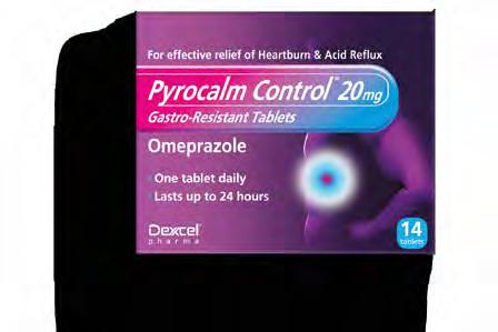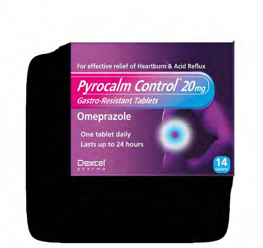 Product Authorisation Holder: Dexcel® Pharma Ltd. 7 Sopwith Way, Drayton Fields, Daventry, Northamptonshire NN11 8PB, United Kingdom. Legal classification: GSL. Product name: Pyrocalm Control® 20mg Gastro-Resistant Tablets. Ingredients: 20 mg Omeprazole. Indications: For the short-term treatment of reflux symptoms (e.g. heartburn, acid regurgitation) in adults. Information about this product, including adverse reactions, precautions, contra-indications, and method of use can be found at: www.medicines.org.uk/emc/ product/9154. Fertility, pregnancy and lactation: Pregnancy: results from three prospective epidemiological studies (more than 1000 exposed outcomes) indicate no adverse effects of omeprazole on pregnancy or on the health of the foetus/newborn child. Omeprazole can be used during pregnancy. Breastfeeding: Omeprazole is excreted in breast milk but is not likely to influence the child when therapeutic doses are used. Omeprazole can be used during breastfeeding. Fertility: Animal studies with the racemic mixture omeprazole, given by oral administration do not indicate effects with respect to fertility. 1NHS Digital, Practice level prescribing data 2018/19 2pubmed. ncbi.nlm.nih.gov/9692700/ 3www.statista.com/statistics/378445/prescription-cost-analysis-top-twenty-chemicals-by-items-in-england/