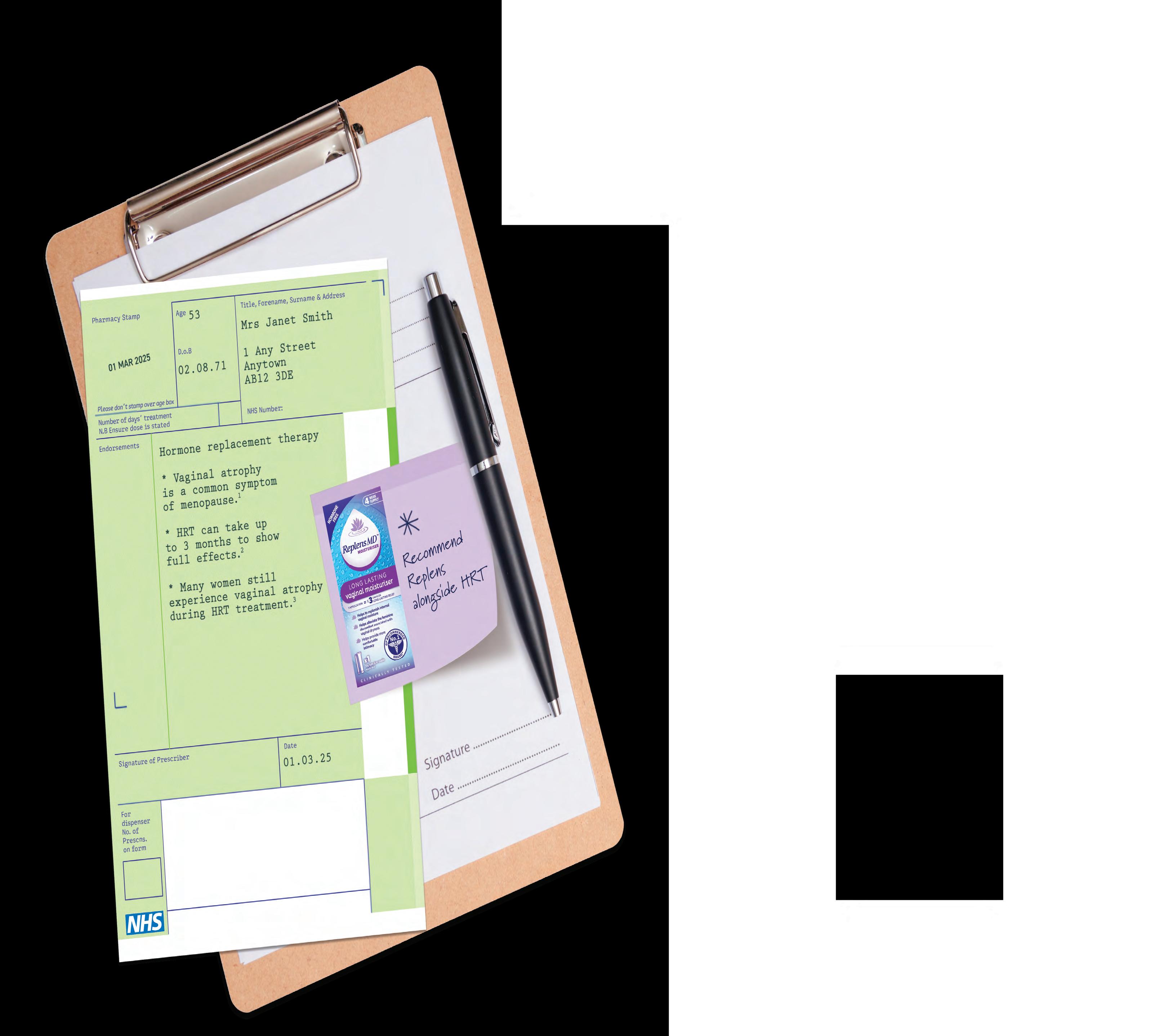 References: 1. NICE CKS. Managing women with menopause, perimenopause, or premature ovarian insufficiency. https://cks.nice.org.uk/topics/menopause/management/management-of-menopause-perimenopause-or-premature-ovarian-insufficiency/. Accessed Nove 24. 2. Nachtigall, LE. Comparative study: Replens vs local estrogen in menopausal women. Fertitity & Sterility. 1994;61 (1):178-180. 3. Bachmann, GA, et al. Long term non-hormonal treatment of vaginal dryness. Clin Pract Sexuality. 1992;8:3-8. 4. Gelfand, MM, et al. Treating vaginal dryness in breast cancer patients: results of applying a polycarbophil moisturising gel. J Women's Health. 1994;3:427-433. 5. NHS. About vaginal ostrogen. January 2023. Available at: https://www.nhs.uk/-medicines/hormone-replacement-therapy-hrt/vaginal-oestregen/about-vaginal-oestrogen Last accessed November 2024. 6. British Menopause Society. Consensus statement. Urogenital atrophy. 2023-2024. 7. GPrX Extract Replens claim 2023. 8. Data on file. CIG Research on Pharmacy Views Attitudes and Opinions. October 2024.