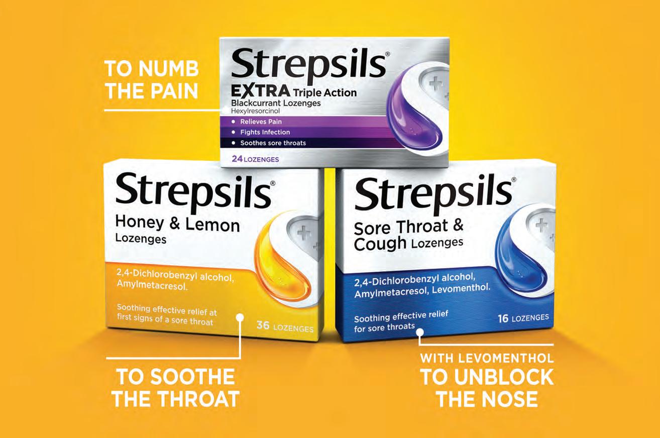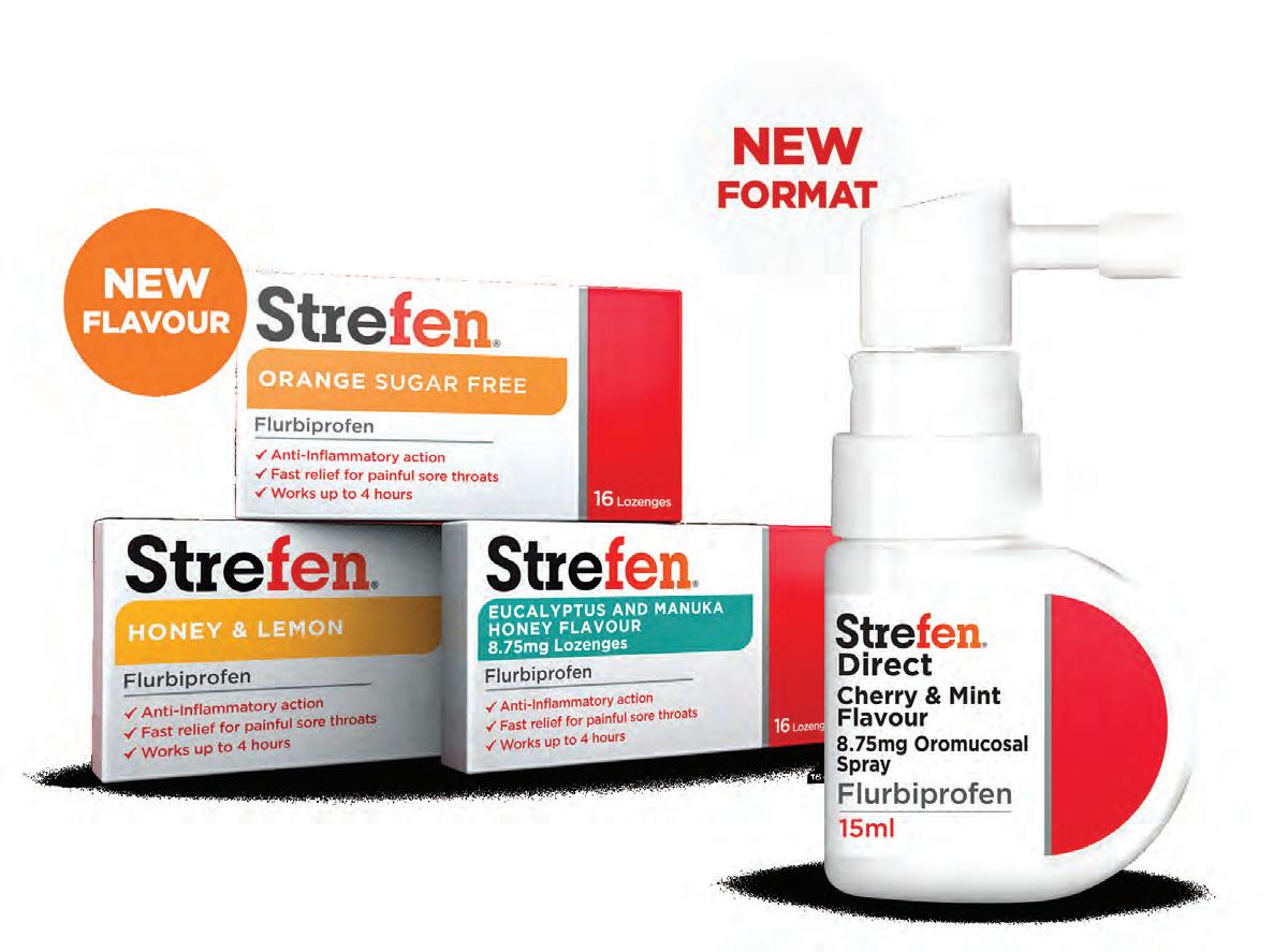 STREFEN HONEY AND LEMON & STREFEN EUCALYPTUS AND MANUKA HONEY FLAVOUR 8.75MG LOZENGES & STREFEN ORANGE FLAVOUR SUGAR FREE 8.75MG LOZENGES: Each lozenge contains flurbiprofen 8.75mg. Indications: For the short term symptomatic relief of sore throat in adults and children over the age of 12 years. Legal Category: P. MA Holder: Reckitt Benckiser Healthcare (UK) Ltd, Slough, SL1 3UH. Information about this product, including adverse reactions, precautions, contraindications, and method of use can be found at: https://www.medicines.org.uk/ emc/product/6514 and https://www.medicines.org.uk/emc/product/15831/smpc and https://www.medicines.org.uk/emc/product/100409/smpc. RT-M-fa9uJ3 July 2025 Recommend Strefen - tackles the pain of bacterial and viral sore throats 1-4,6,7