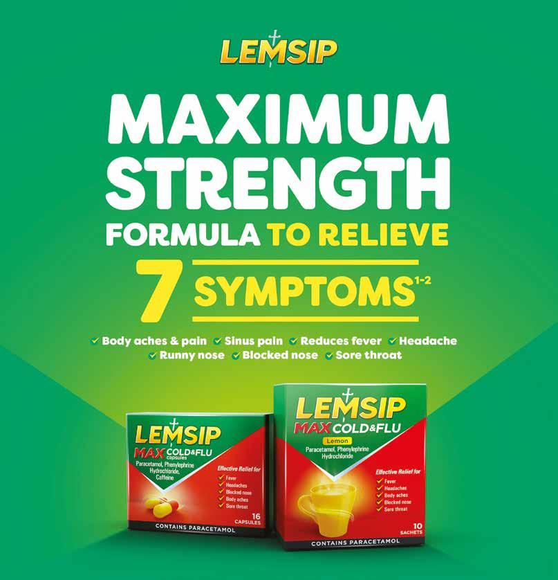 LEMSIP MAX COLD & FLU LEMON: Each powder sachet contains Paracetamol 1000mg, Phenylephrine Hydrochloride 12.2mg. Indications: For relief of the symptoms of colds and influenza, including the relief of aches and pains, sore throat, headache, nasal congestion and lowering of temperature. Legal Category: GSL. MA Holder: Reckitt Benckiser Healthcare (UK) Ltd, Hull, HU8 7DS. Information about this product, including adverse reactions, precautions, contra-indications, and method of use can be found at: https://www.medicines.org.uk/emc/product/5612/smpc