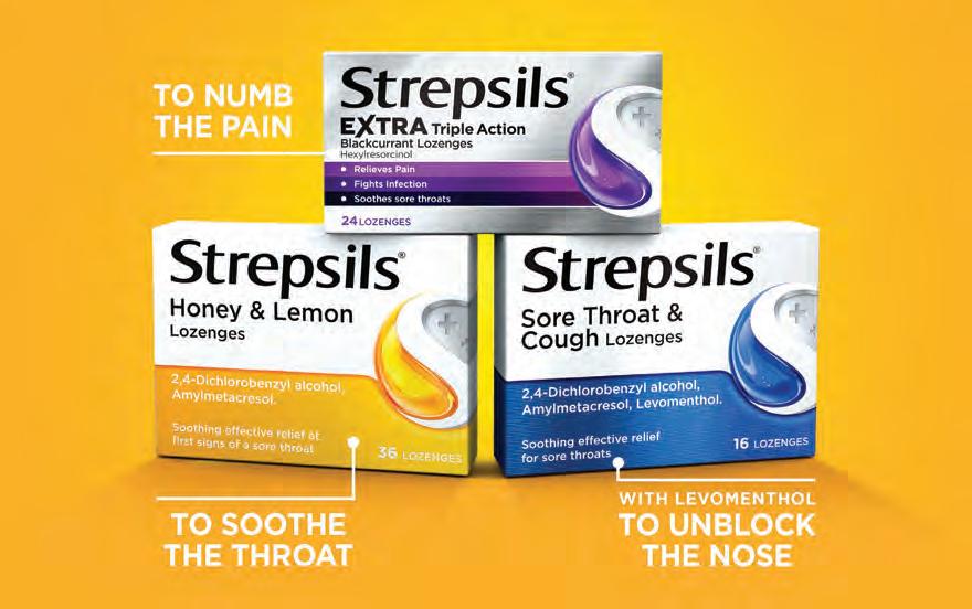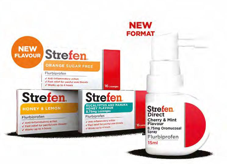 FLAVOUR 8.75MG LOZENGES & STREFEN ORANGE FLAVOUR SUGAR FREE 8.75MG LOZENGES: Each lozenge contains flurbiprofen 8.75mg. Indications: For the short term symptomatic relief of sore throat in adults and children over the age of 12 years. Legal Category: P. MA Holder: Reckitt Benckiser Healthcare (UK) Ltd, Slough, SL1 3UH. Information about this product, including adverse reactions, precautions, contraindications, and method of use can be found at: https://www.medicines.org.uk/ emc/product/6514 and https://www.medicines.org.uk/emc/product/15831/smpc and https://www.medicines.org.uk/emc/product/100409/smpc. RT-M-fa9uJ3 July 2025 Recommend Strefen - tackles the pain of bacterial and viral sore throats 1-4,6,7 From the makers of