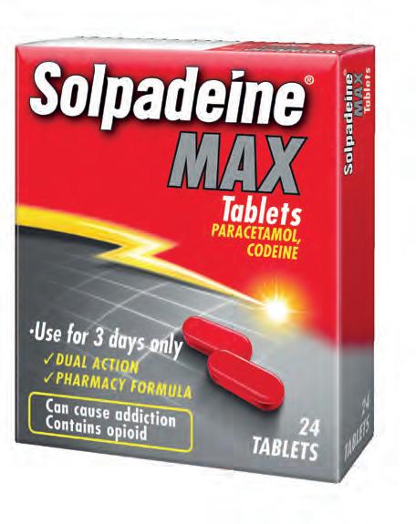 Solpadeine Max Tablets, Paracetamol 500mg, Codeine Phosphate Hemihydrate 12.8mg (P) contain paracetamol and codeine phosphate hemihydrate. For the treatment of acute moderate pain which is not relieved by paracetamol or ibuprofen alone, including migraine, headache, dental pain, period pain, backache, arthritic & rheumatic pain, strains & sprains and sciatica. MAH: Omega Pharma Ltd, Wrafton, Braunton, Devon, EX33 2DL UK. Information about this product, including adverse reactions, precautions, contra-indications and method of use can be found at: https://mhraproducts4853.blob.core.windows.net/docs/a255c8b82e05611d81b8ecebc7a8b54753c0c306