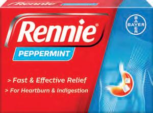 Rennie® Peppermint (Calcium Carbonate 680mg and Magnesium Carbonate 80mg). Indications: For relief of indigestion and heartburn. MA Holder: Bayer plc, 400 South Oak Way, Reading, RG2 6AD, UK (information about this product, including adverse reactions, precautions, contra-indications, and method of use can be found at https://www. medicines.org.uk/emc/product/13863/smpc). Legal Category: GSL. Date of Preparation: March 2023. ® Registered trademark of Bayer AG.