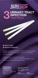 Urinary tract infections (UTIs) are common infections which affect the urinary tract, including the bladder (cystitis) urethra (urethritis) or kidneys (kidney infection). Suresign urinary tract infection test strips can aid in the detection of elevated levels of Leukocytes or Nitrites in urine, indicating inflammation or potential bacterial infection in the patient. Contains three dipstick tests.