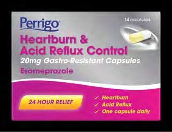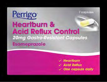 Perrigo Heartburn and Acid Reflux Control 20 mg Gastro Resistant Capsules (GSL) contain esomeprazole (as magnesium dihydrate). For the short-term treatment of reflux symptoms (e.g. heartburn and acid regurgitation) in adults. Adults 18 years and over: One capsule per day. It may be necessary to take the capsules for 2-3 consecutive days to achieve improvement of symptoms. The duration of treatment is up to 2 weeks. Contraindications: known hypersensitivity to esomeprazole, substituted benzimidazoles or to any of the excipients, concomitant use with nelfinavir. Caution: history of gastric ulcer or GI surgery, suspected gastric ulcer or malignancy, jaundice, severe liver disease, or aged over 55 years with new or changed symptoms, increased risk of GI infection. Interference with lab tests for neuroendocrine tumours. This medicine contains 0.0018mg benzoic acid in each capsule. Pregnancy and breast-feeding: avoid in pregnancy and do not use during breast-feeding. Interactions: atazanavir, ritonavir, saquinavir, methotrexate, tacrolimus, digoxin, warfarin, phenytoin, citalopram, imipramine, clomipramine, diazepam, clopidogrel. Side effects: hypersensitivity reactions e.g. angioedema & anaphylactic reaction, agranulocytosis, thrombocytopenia, leukopenia, pancytopenia, hepatic failure, erythema multiforme, Stevens-Johnson syndrome, toxic epidermal necrolysis (TEN), subacute cutaneous lupus erythematosus (SCLE), headache, abdominal pain, constipation, diarrhoea, flatulence, nausea, vomiting, fundic gland polyps (benign), bronchospasm. PL 16028/0166. MAH: Galpharm Healthcare Limited, Wrafton, Braunton, Devon, EX33 2DL, UK. Date of preparation: 08/2021. RRP (ex. VAT): 7s £4.99,14s £8.99. MAT-9749