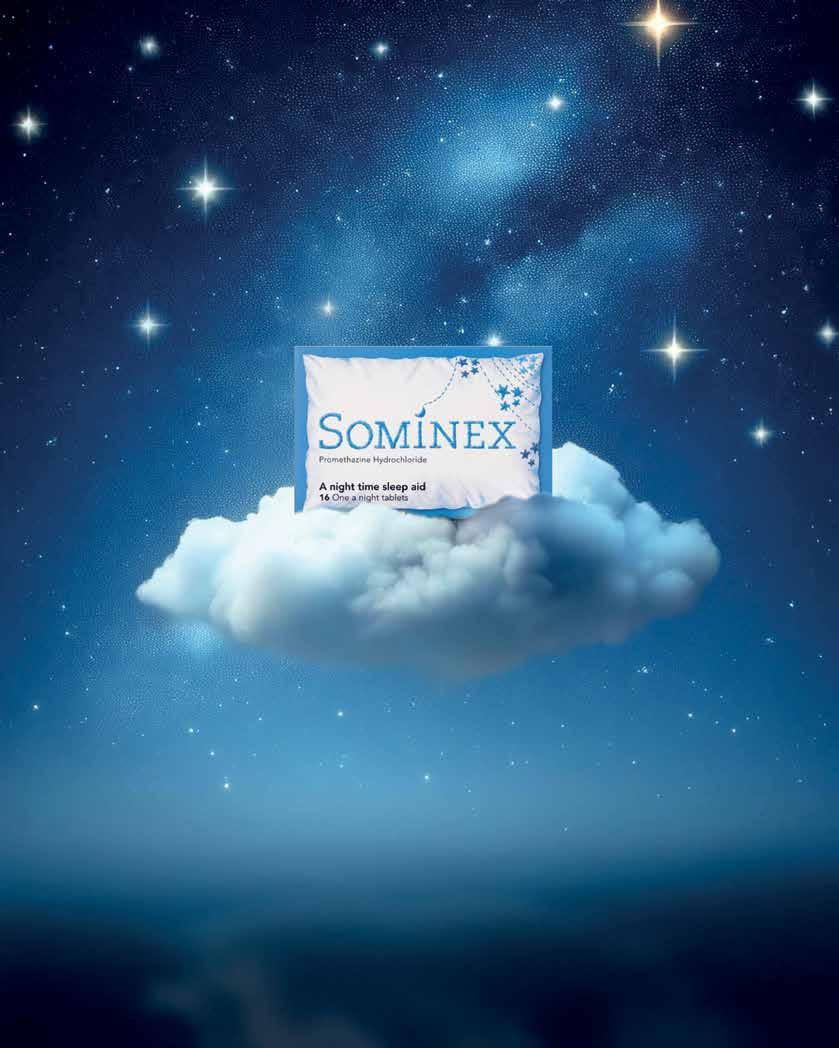 Product name: Sominex. Ingredients: Promethazine hydrochloride EP 20mg/tab. Pharmacutical form: Tablet. Indications: As a night-time sleep aid, for the correction of temporary disturbances of sleep pattern where there is difficulty in going to sleep or staying asleep, caused for example by specific dislocation of normal routine. Route of administration: For oral administration. For bedtime use only. Adults: one tablet at bedtime. May be taken up to one hour after going to bed when sleep is difficult to achieve.