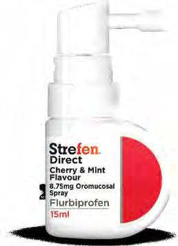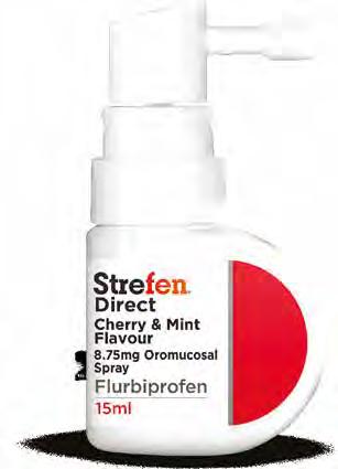 STREFEN DIRECT CHERRY AND MINT FLAVOUR 8.75MG OROMUCOSAL SPRAY: One actuation contains 2.92 mg of Flurbiprofen, three actuations equal to one dose contains 8.75mg, corresponding to 16.2 mg/ml Flurbiprofen. Indications: For the short term symptomatic relief of acute sore throat in adults. Legal Category: P. MA Holder: Reckitt Benckiser Healthcare (UK) Ltd, Slough, SL1 3UH. Information about this product, including adverse reactions, precautions, contra-indications, and method of use can be found at: https://www.medicines.org.uk/emc/product/15868/ smpc#gref.