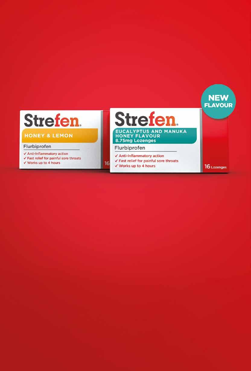 STREFEN HONEY AND LEMON & STREFEN EUCALYPTUS AND MANUKA HONEY FLAVOUR 8.75mg LOZENGES: Each lozenge contains flurbiprofen 8.75mg. Indications: For the short term symptomatic relief of sore throat in adults and children/ adolescents over the age of 12 years. Legal Category: P.