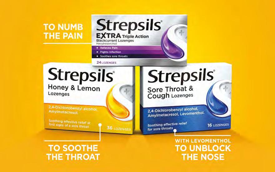 References: 1. McNally D, et al. Int J Clin Pract. 2010;64:194–207 2. Wade AG, et al. BMC Fam Pract. 2011;12:6. 3. Matthews D, et al. Int J Gen Med. 2018; 11:451–456. 4. Oxford JS, et al. Antivir Chem Chemother. 2005;16:129-134. 5. Shephard A, et al. Antiviral Res. 2015;123:158-162. 6. Morokutti-Kurz M, et al. Int J Gen Med. 2017;10:53–60. 7. Weckmann G, et al. Int. J Clin Pract. 2017;71(10) 8. EMC, electronic medicines compendium. Strepsils Honey & Lemon. Updated April 2021. Accessed June 2025. Available at https://www.medicines.org.uk/emc/product/5606 9. EMC, electronic medicines compendium. Strepsils Extra Triple Action Blackcurrant Lozenges. Updated August 2021. Accessed June 2025. Available at https://www.medicines.org.uk/emc/product/5601 10. EMC, electronic medicines compendium. Strepsils Sore Throat and Cough. Updated May 2021. Accessed June 2025. Available at https://www.medicines.org.uk/emc/product/8142
