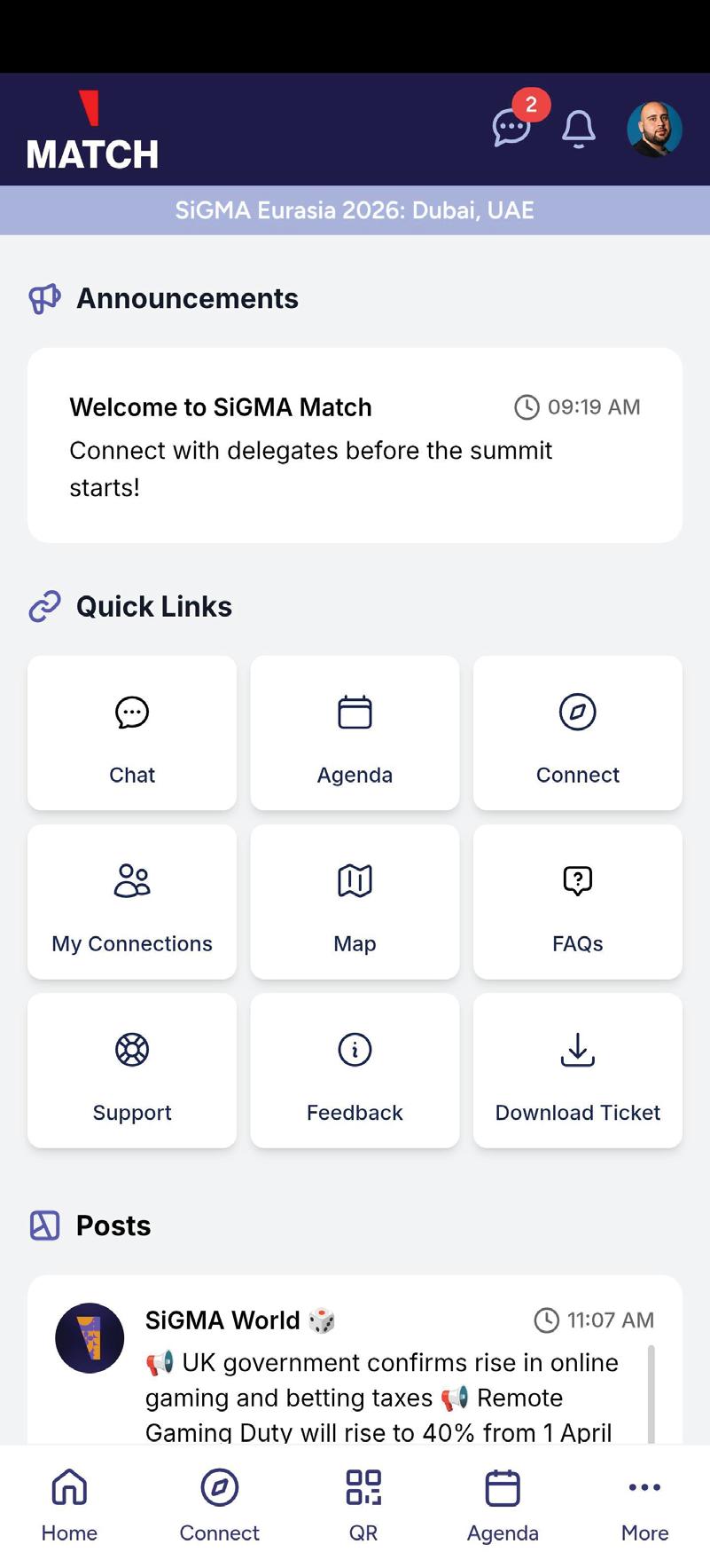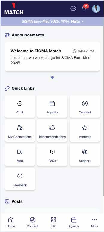 Announcements Feed – Displays important updates, reminders, and news from the organizers (e.g., “Welcome to SiGMA Match”, event countdowns, or last-minute changes).
