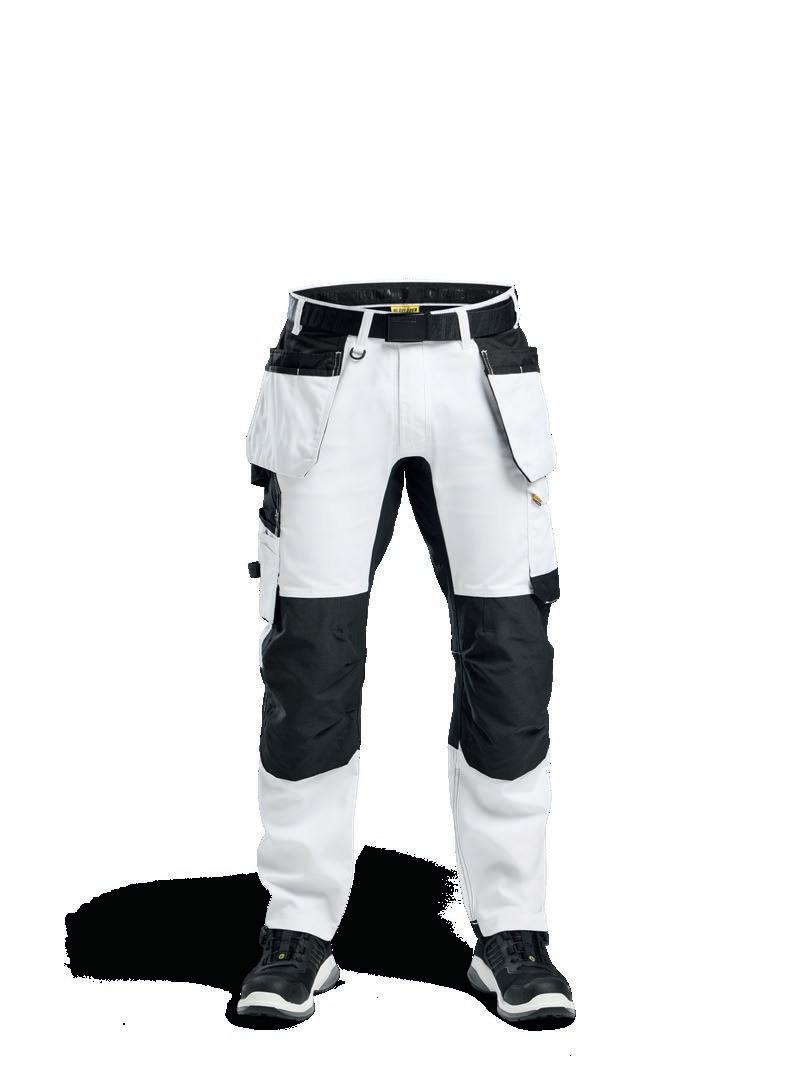 LOMMER: Baklommer med belg, Benlomme med belg og klaff med borrelåslukking samt innfelt telefonlomme i mesh, Benlomme med glidelås, Innstikkslommer, Kneputelommer, Verktøylommer – ekstra brede, utstyrt med verktøyhemper og ekstra verktøyrom, Forsterket tommestokklomme med knivholder og pennelomme FORSTERKNING: Cordura®-stretchforsterkede kneputelommer, Forsterkning på tommestokklomme, verktøylommer og baklommer