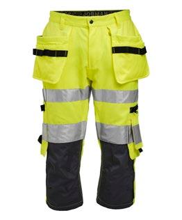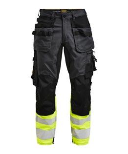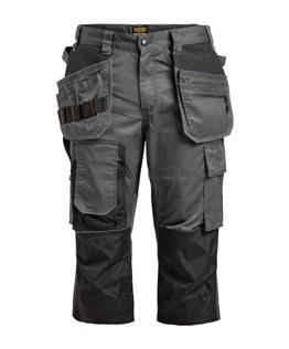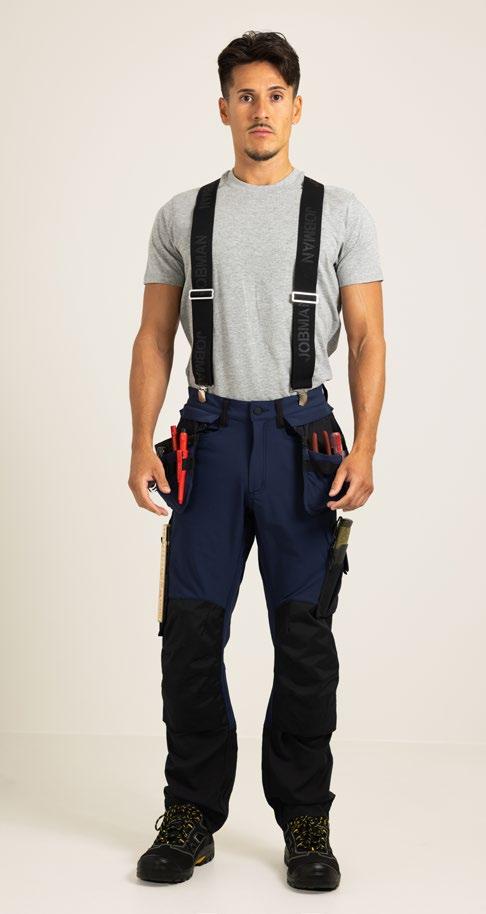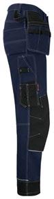 Smidig arbetsbyxa i 4-vägs stretch med partier av slitstarkt vävt tyg vid benslut, benfickor och hölsterfickor. Avtagbara hölsterfickor med zip-in funktion och med extrafack och förstärkt insida, kan stoppas ned i framfickorna. Stretchigt midjeband. Stolpfickor bak. Hammarhank. Tumstocksficka med knivhållare. Benficka med täckt blixtlås, ID-kortsfack och telefonfack. Förböjda knän med knäskyddsfickor i slitstark polyamid med 2 höjdnivåer för knäskydd inuti. Mesh i knävecken för ventilation. Byxbenet kan förlängas med 5 cm genom ett utvik i benslutet. Certifierad enligt EN 14404:2004+A1:2010 Typ 2 Nivå 1 tillsammans med Jobmans knäskydd 9943, 9944 och 9945.