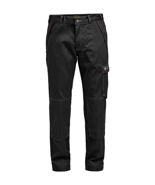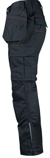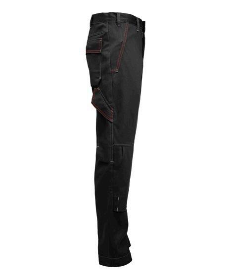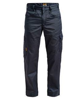 Servicebyxa med stretch. Dold knapp fram för ”Non-scratch” design. Benficka på högersida med plats för tumstock och benficka på vänster sida med ficklock med plats för pennor. D-ring i hällan fram för ID-korthållare. Knäskyddsficka på insidan. Byxan är något mindre i storlek då elastiken i midjan är fastare för bättre hållbarhet. Eftersom byxan är helt i stretch kan innerbenslängden upplevas kortare. Byxbenet kan förlängas med 5 cm genom att enkelt sprätta den röda sömmen.