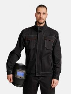 100% flamskyddsbehandlat bomull. CE-certifierat, testat och godkänt enligt EN ISO 11611 och EN ISO 11612. Certifieringen innebär att materialet och plaggets design skyddar mot kantantändning och flamspridning, det smälter inte. Det står också emot hetta enligt testnormerna vilket motverkar brännskador.