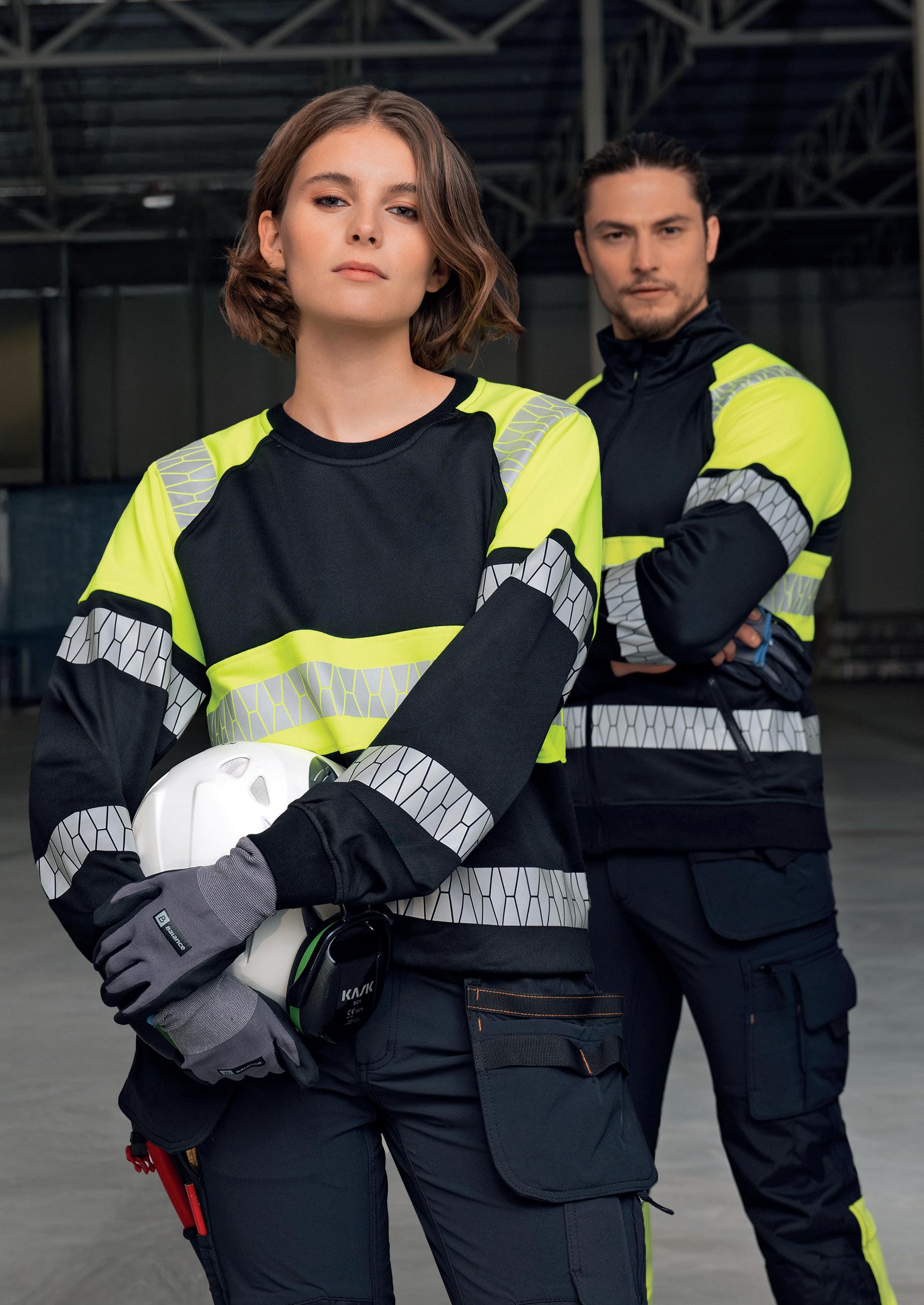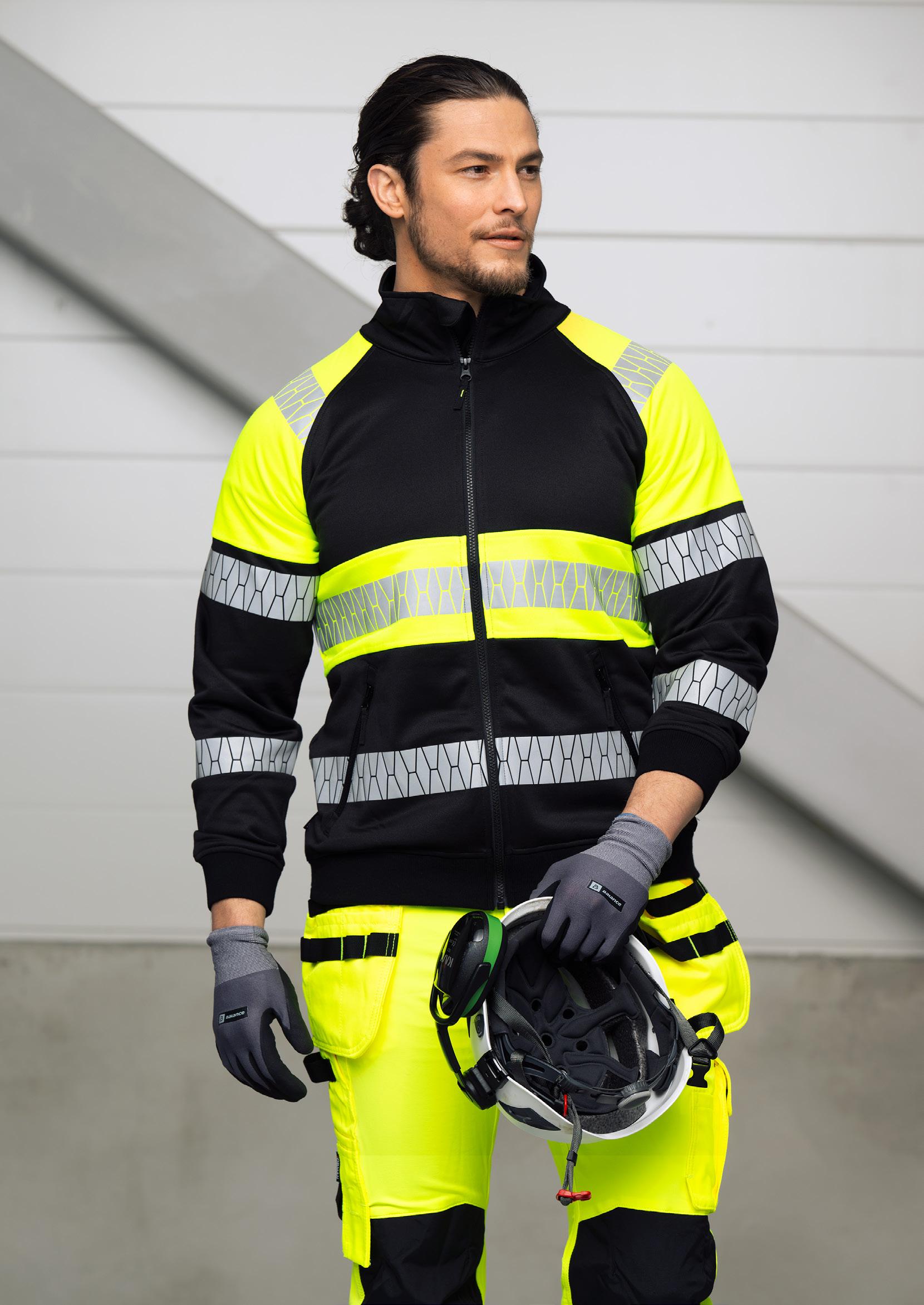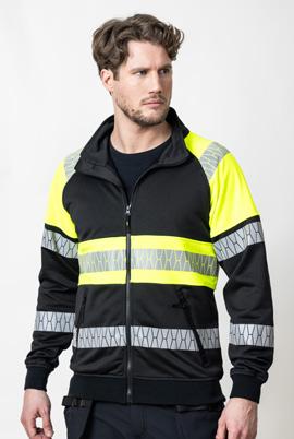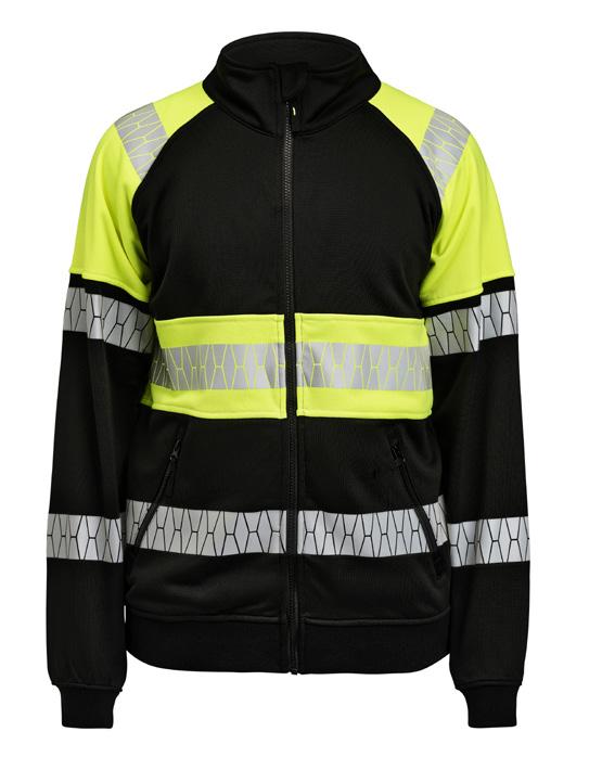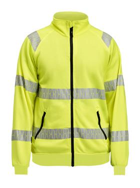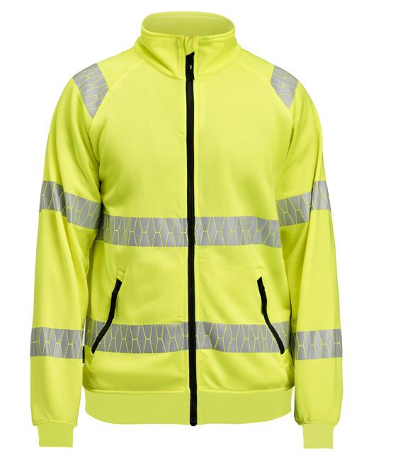 Sweatshirt hel-zip i behagligt material, med öglad insida. Blixtlås fram i metall. Blixtlåsförsedda framfickor. Ribb i nederkant och ärmavslut. Påvärmd reflextransfer, Jobman design. Reflexer över axlarna för ökad synbarhet. Certifierad i varselklass 2/3 enligt EN ISO 20471.