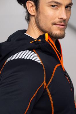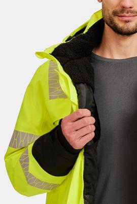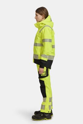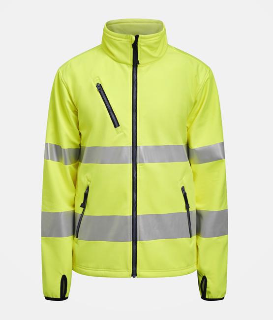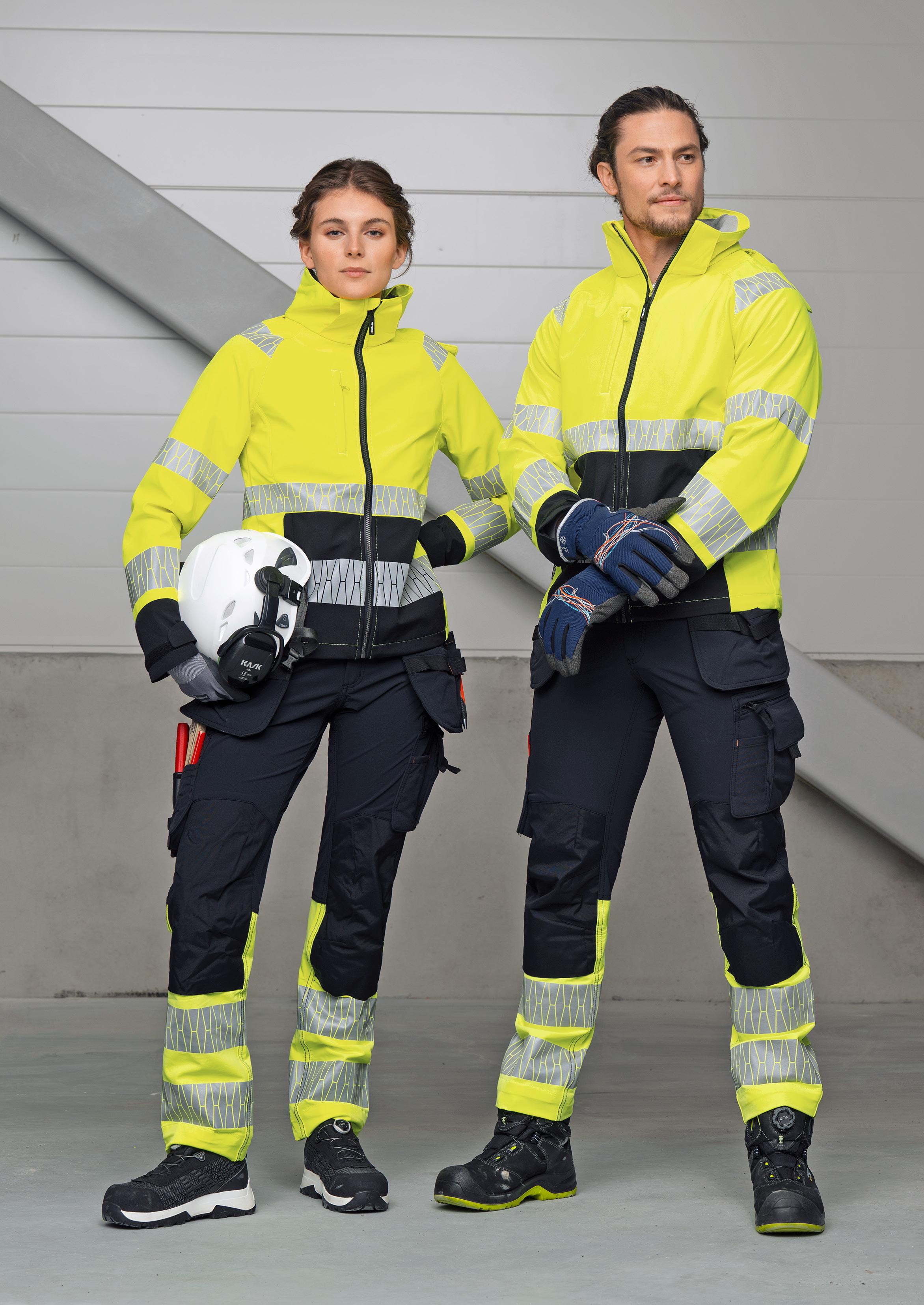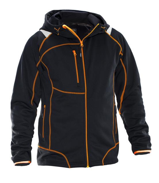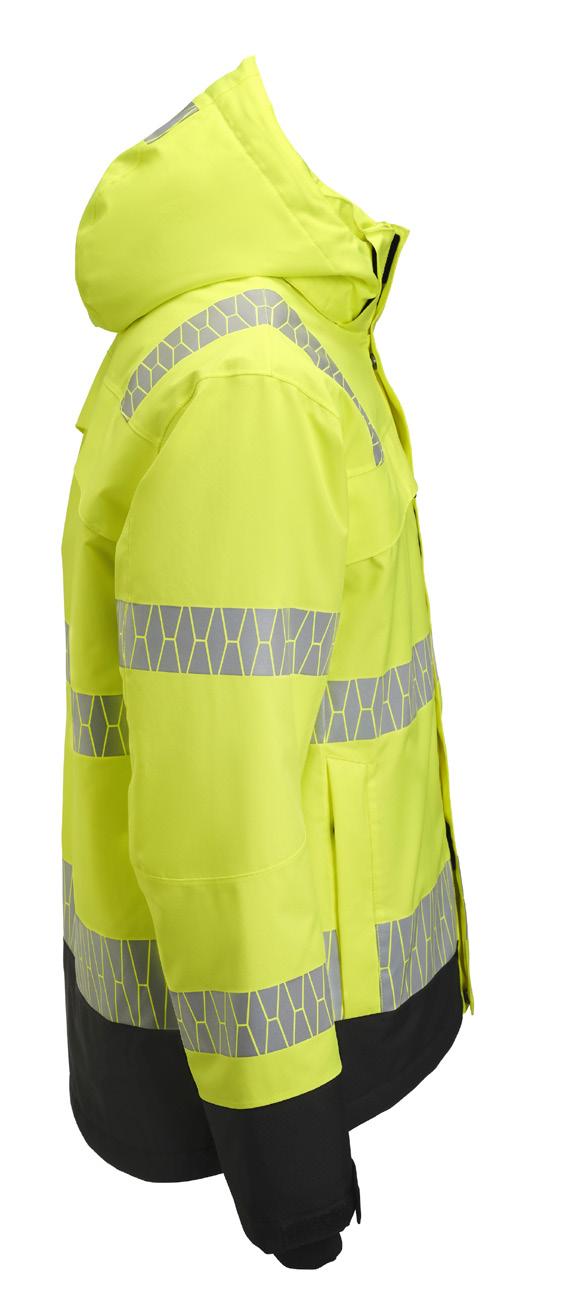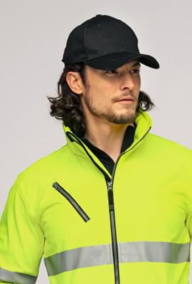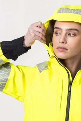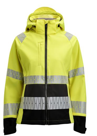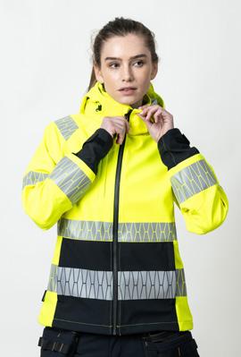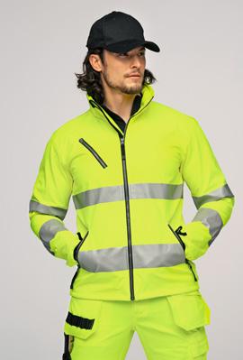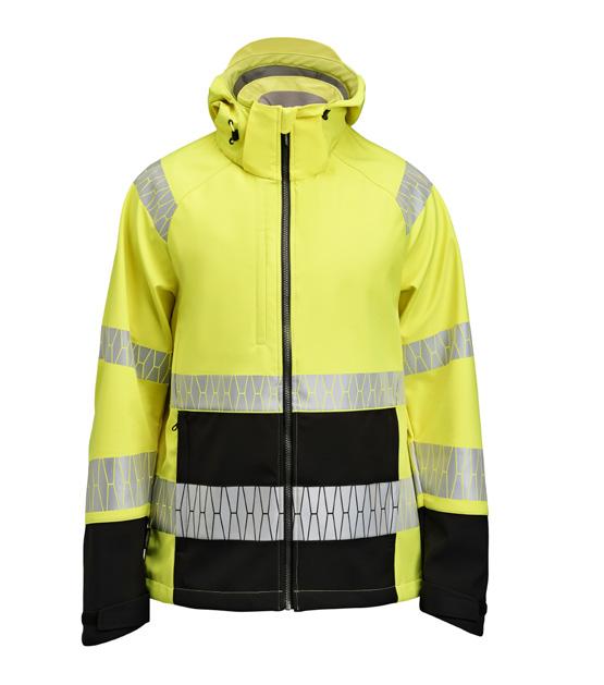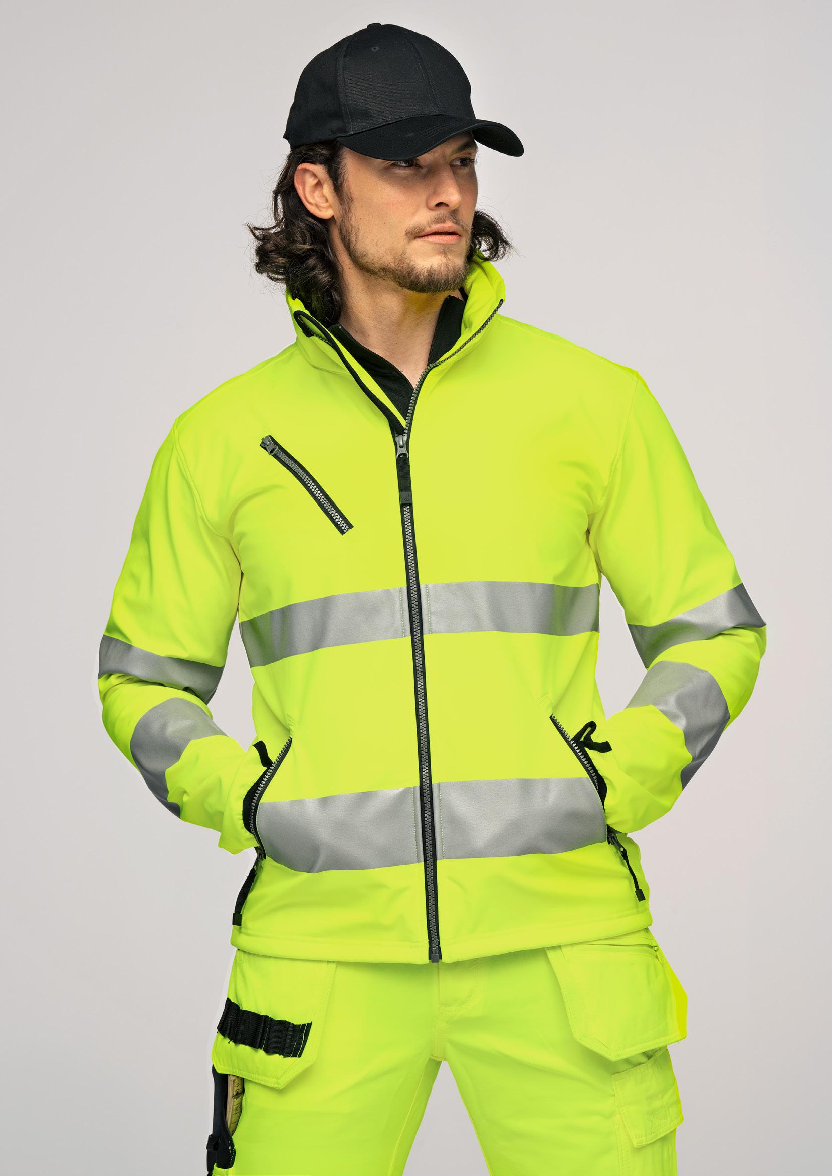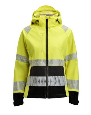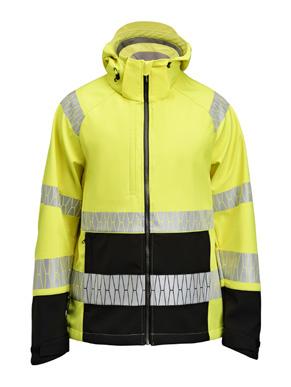 Softshelljacka Varsel med svarta kontrast ytor. Avtagbar huva, elastisk dragsko runt öppningen. Blixtlåsförsedda framfickor och bröstficka på höger sida fram. Insida i ”birdeye knit” ger bra fukttransport. Blixtlås fram av delrin typ med vattenavvisande zip-tape. Jackan är reglerbar med elastisk dragsko nedtill. Förböjda ärmar. Reglerbara ärmavslut med kardborre-straps. Vattenpelare: 8000 mm. Andasfunktion: 5000 g/m² 24h. Yttertyget har en flourkarbonfri BIONIC-FINISH® DWR-behandling. Certifierad i varselklass 2/3 enligt EN ISO 20471 - Storlek XS-3XL