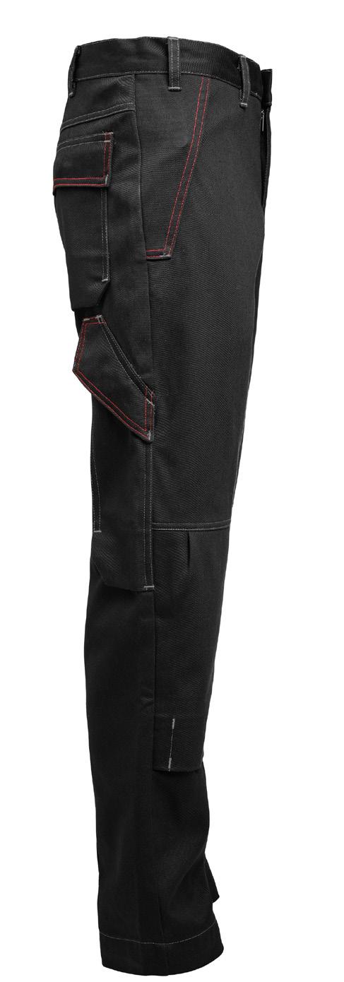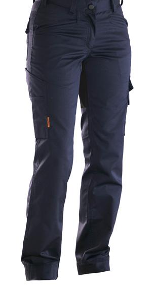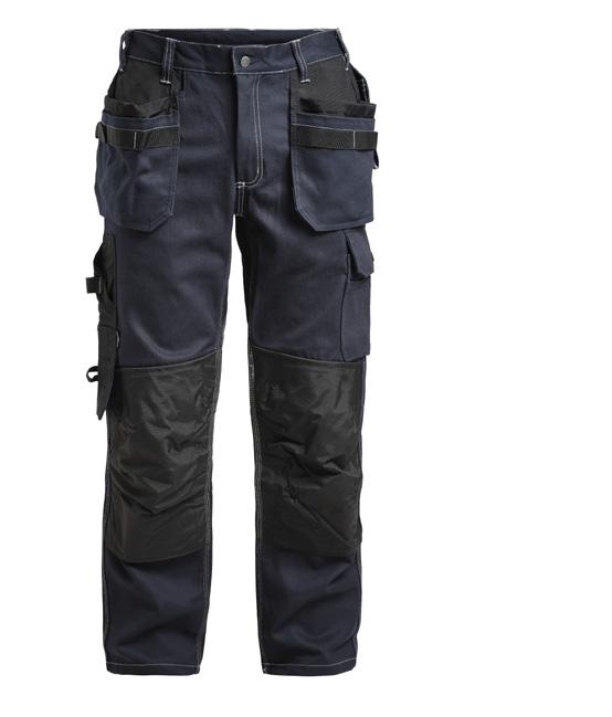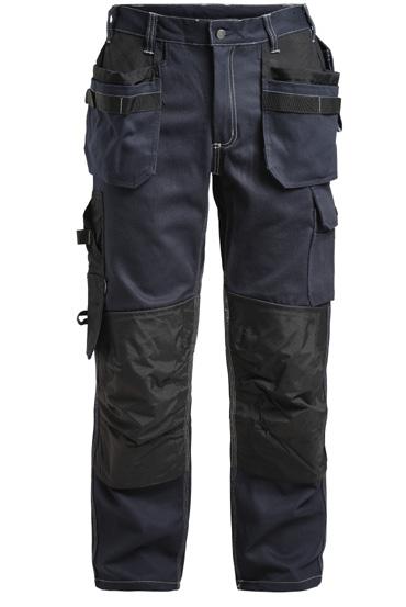 Servicebyxa med stretch. Dold knapp fram för ”Non-scratch” design. Benficka på högersida med plats för tumstock och benficka på vänster sida med ficklock med plats för pennor. D-ring i hällan fram för ID-korthållare. Knäskyddsficka på insidan. Byxbenet kan förlängas med 5 cm genom ett utvik i benslutet. Tål hög tvättemperatur upp till 75 grader. Testad enligt EN ISO 15797-8 och Oeko-tex made in green.