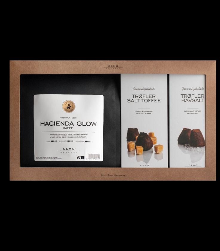 Gaveeske med Hacienda glowkaffe og to varianter av utsøkte sjokoladetrøfler. En perfekt kombinasjon for den som elsker det lille ekstra.