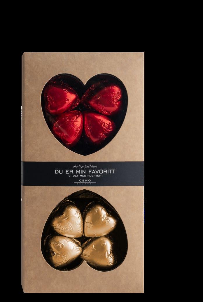Gull sjokoladehjerter med belgisk sjokolade og myk karamell.