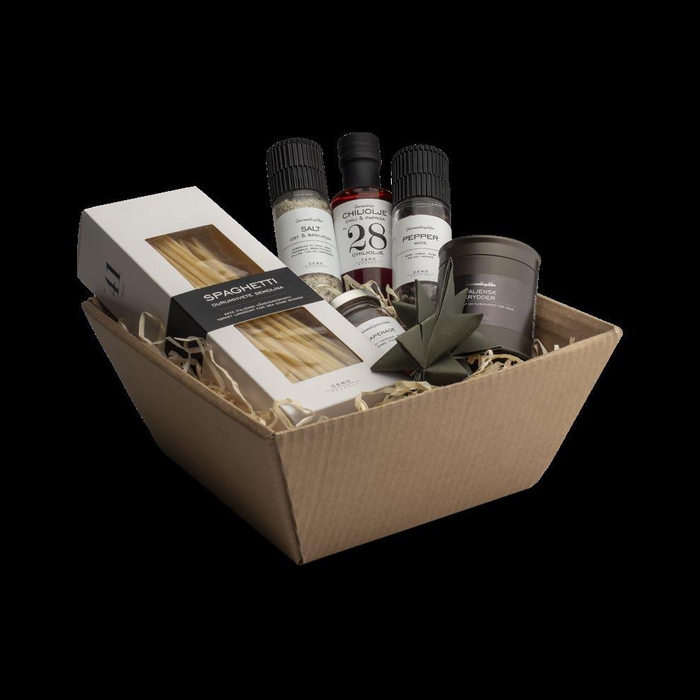 Denne gavekurven er pakket vakker cellofan med sløyfe og fylt med delikatesser som gjør det enkelt å skape en liten fest på kjøkkenet. Her finner du klassisk spaghetti, aromatisk italiensk krydder, smakfull chiliolje, salt med ost & basilikum, en balansert peppermiks og en rik tapenade.