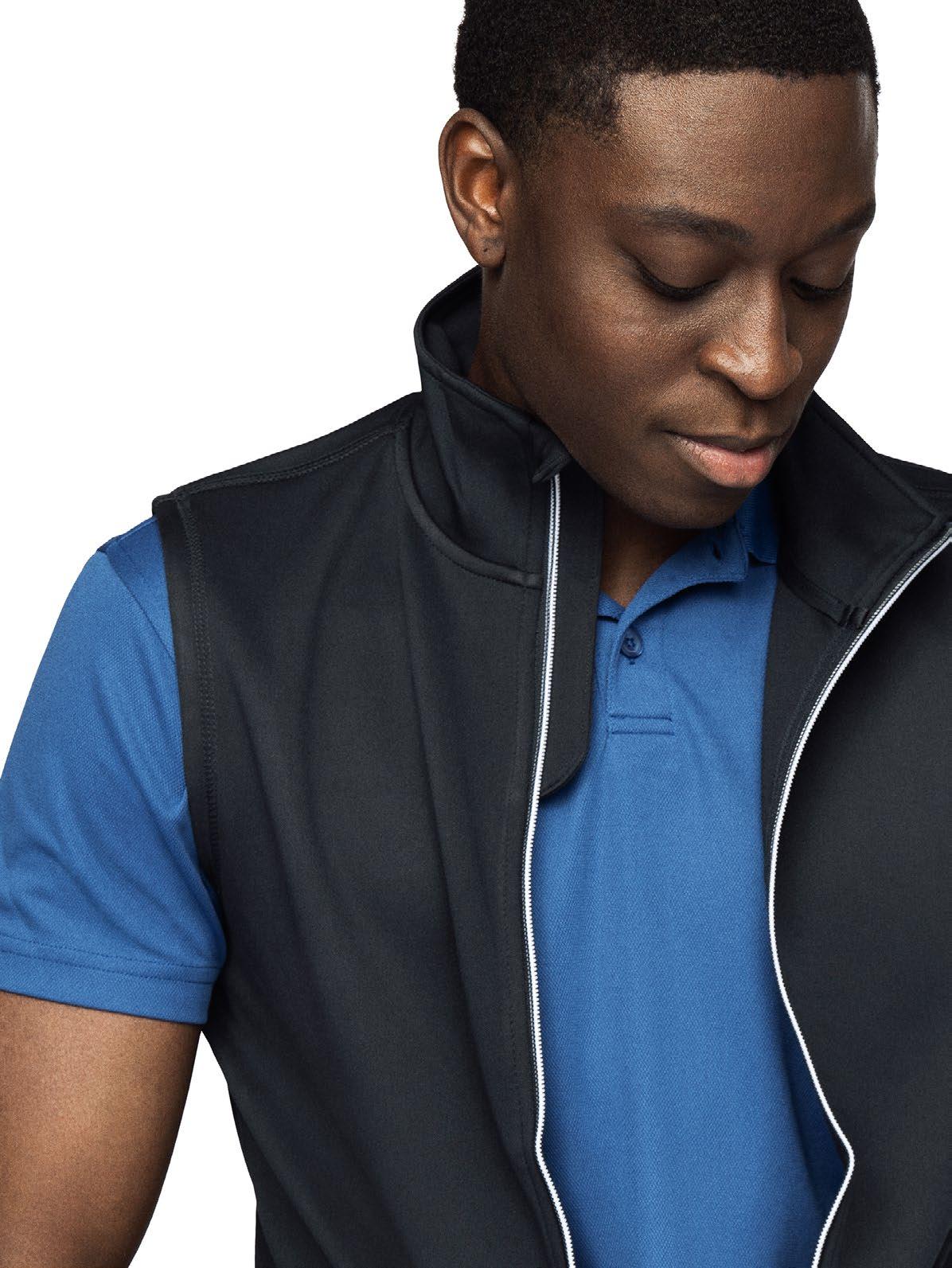 Väst i polyesterstretch. Kontrast i dragkedja och interlocksömmar.