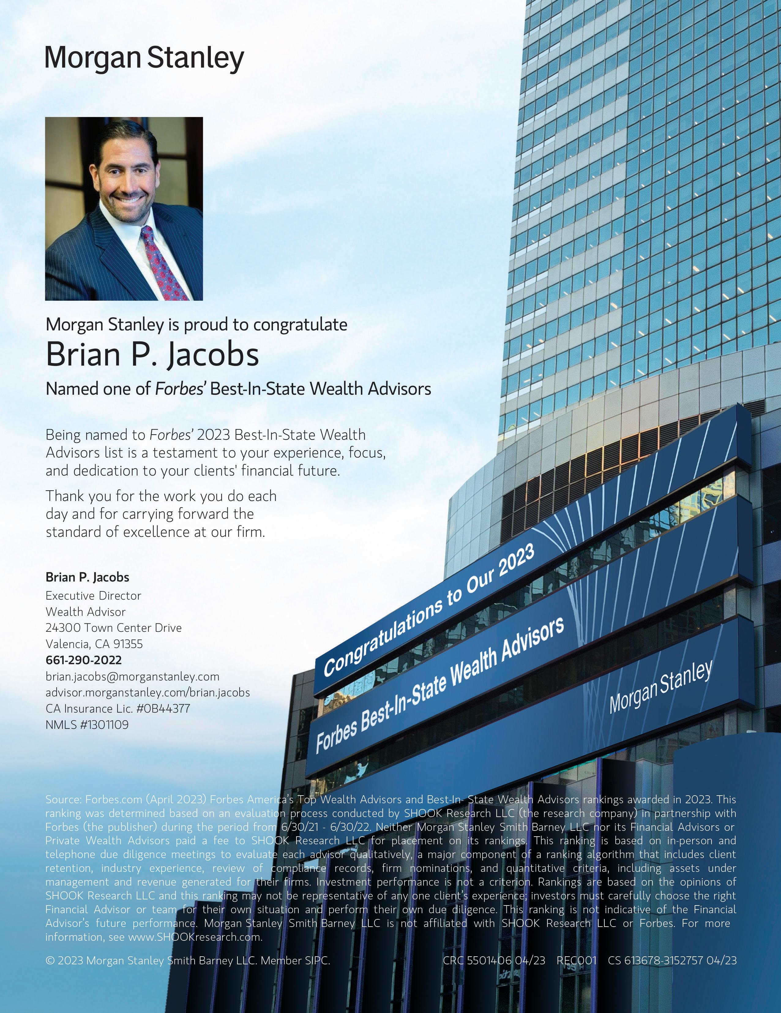 Courtesy of: Brian Jacobs, Executive Director, Wealth AdvisorBranch Name: Morgan Stanley, Valencia, CA Phone Number: (661) 290-2022.