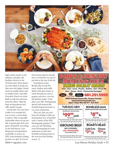 Secret Santa doesn’t already have a Crock-Pot, be sure to put that at the top of the list. Touchdown treats. Recipes like Crock-Pot tacos, chicken and waffle sliders with spicy honey or ranch dressing are easy to prepare and serve, even for the kitchen rookie. Complete your NFL Homegating spread with desserts like football-shaped brownies or ice cream sandwiches. This year, fans can celebrate the holidays while embracing their love of football with a variety of fun NFL Homegating products. Fans cans can visit NFLShop. com/Homegating for more inspiration to take their football-watching parties to the next level this holiday season. c