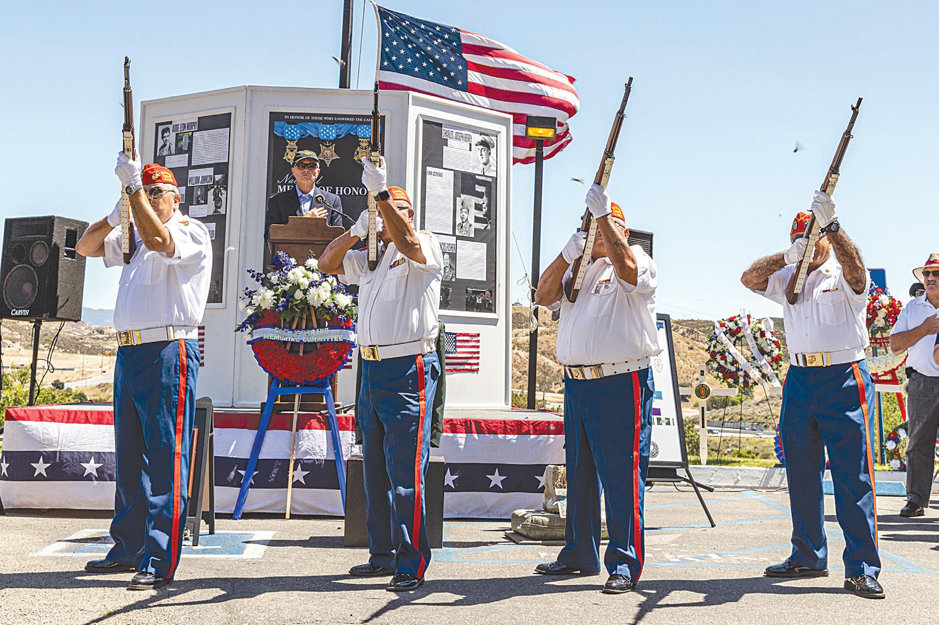 Members of the Ronald Reagan Marine Corps League fire their rifles as part of the “Retire The Colors” ceremony during the Memorial Day Tribute 2022. PHOTO BY CHRIS TORRES / THE SIGNAL American flags flutter around the grave of U.S. Navy veteran Earl Taylor who served in Korean and Vietnam and died in 2011. Taylor’s grave is one of the more than 5,800 marked by American flags at Eternal Valley Memorial Park & Mortuary at last year’s Memorial Day. PHOTO BY DAN WATSON / THE SIGNAL