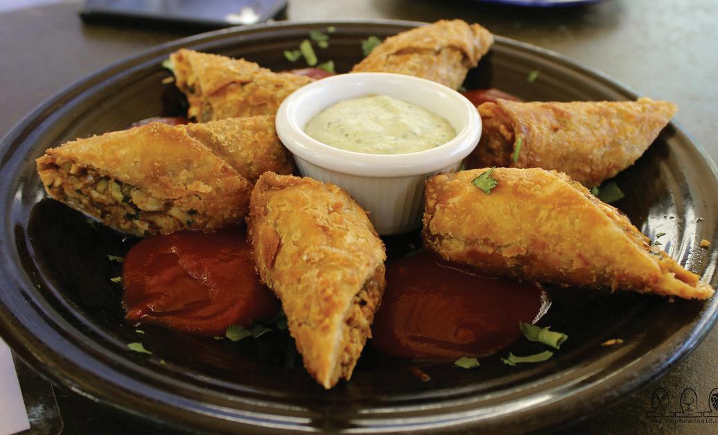 The Taos Egg Rolls are made with chicken, cilantro, corn, avocado, cheese, roasted red peppers, red onion and served with avocado cream and chipotle ketchup.