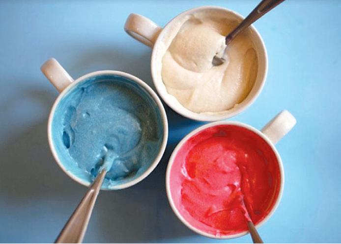 When I made them, I wanted more than just the tops to resemble snow cones though. I wanted the cupcake to be tri-colored too. But not the usual layered look you see from bottom to top.