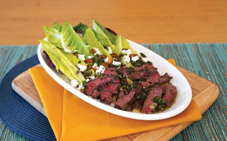 Slice steak into 3-inch pieces then slice against grain to cut steak into wide strips. Add sliced steak to platter. Drizzle reserved dressing on romaine and steak. (Family Features)